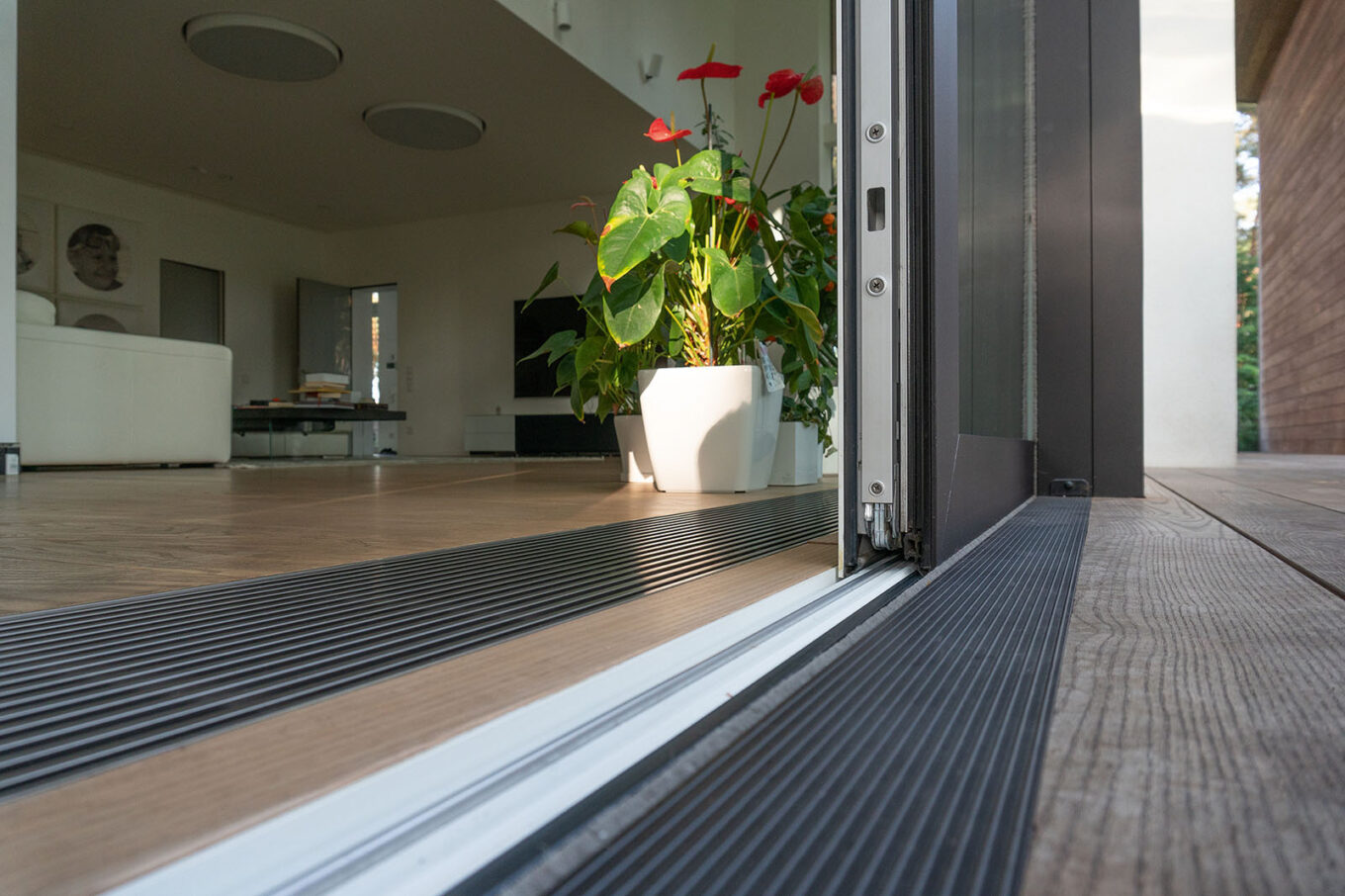 Фрагмент системы раздвижных алюминиевых дверей MasterPatio от Reynaers Aluminium. Частная резиденция, ракурс интерьера гостиной с выходом на террасу. Фото предоставлено ООО «Крафт»