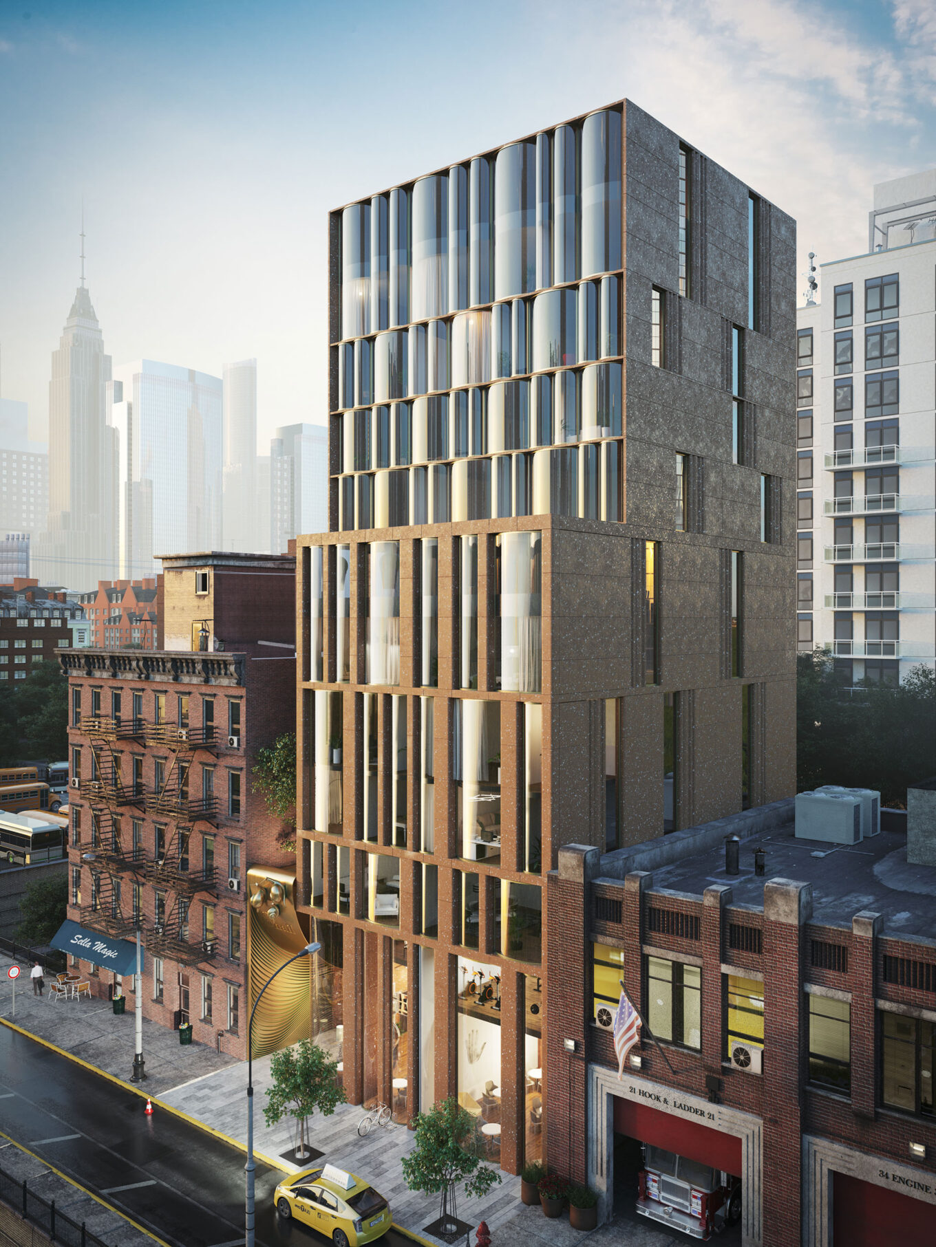Расскажу немного о том, как формировался архитектурный образ Snail-apartments: свои требования диктовала сама локация, среда. Наш объект расположен на типичной для Манхэттена довольно оживленной и шумной днем улице. Поэтому нижняя часть фасада (первые четыре этажа) несет двойную функцию. Благодаря толстым простенкам она выглядит как визуальная защита, апеллируя к архетипу «стеновой архитектуры», главная роль которой — в создании безопасного убежища. Одновременно довольно массивные стены защищают внутренние пространства от уличного шума. Верхняя часть здания — более воздушная, с большим объемом остекления. Это уже отсылка к современной архитектуре Нью-Йорка и возможность раскрыть обзор на живописные виды за окном. Индивидуальность визуальному образу здания придает прежде всего оригинальное остекление — окна с гнутым, моллированным стеклом.