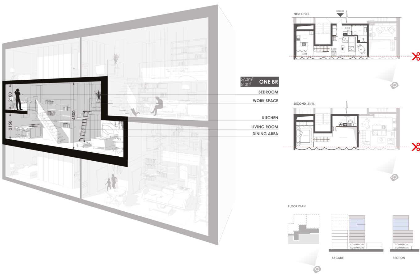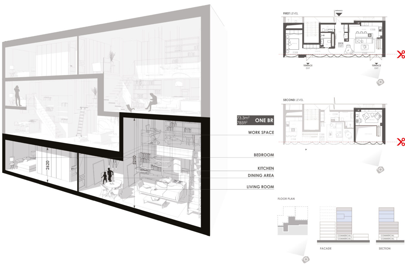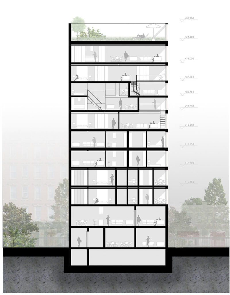 Разбивка на функциональные блоки. Снизу вверх: коммерческий; coliving; односпаленные PRO-apartments; полутораэтажные, односпаленные PRO-apartments; пентхаус. Источник изображения: аrchimatika, 2019 г.