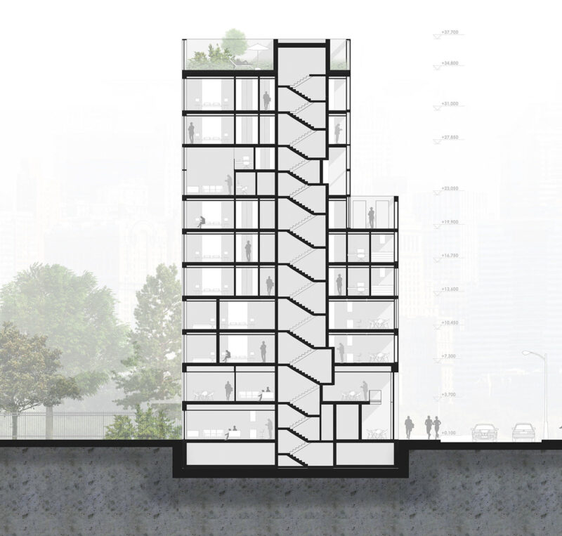 Пропорции и высота здания Snail-apartments соответствуют жестким градостроительным нормам Нью-Йорка. Источник изображения: аrchimatika, 2019 г.
