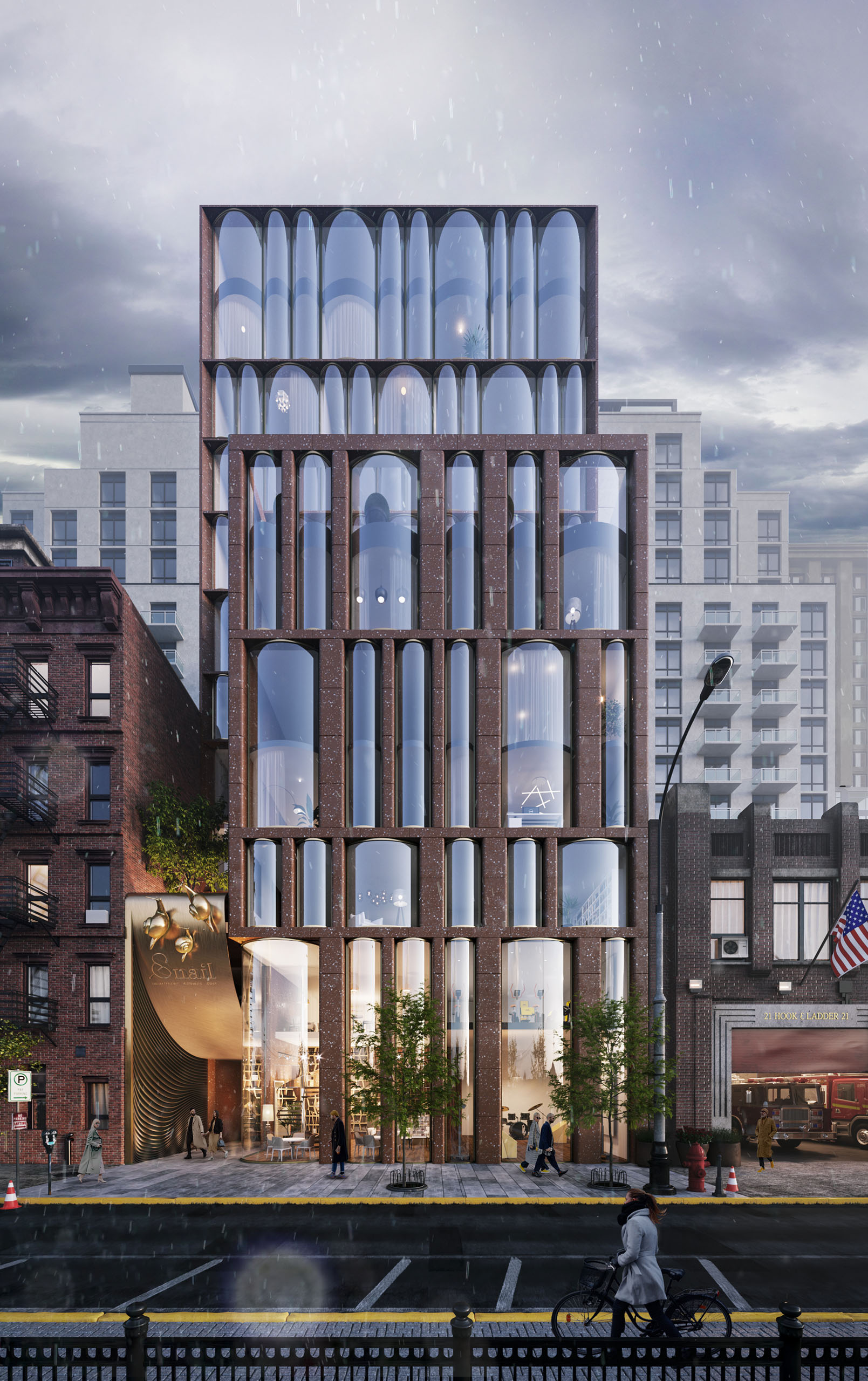 PRAGMATIKA.MEDIA: Первое, что бросается в глаза, когда рассматриваешь визуализации вашего нью-йоркского проекта, — огромные латунные улитки, поднимающиеся вверх от входной группы. И рабочее название комплекса использует этот образ…