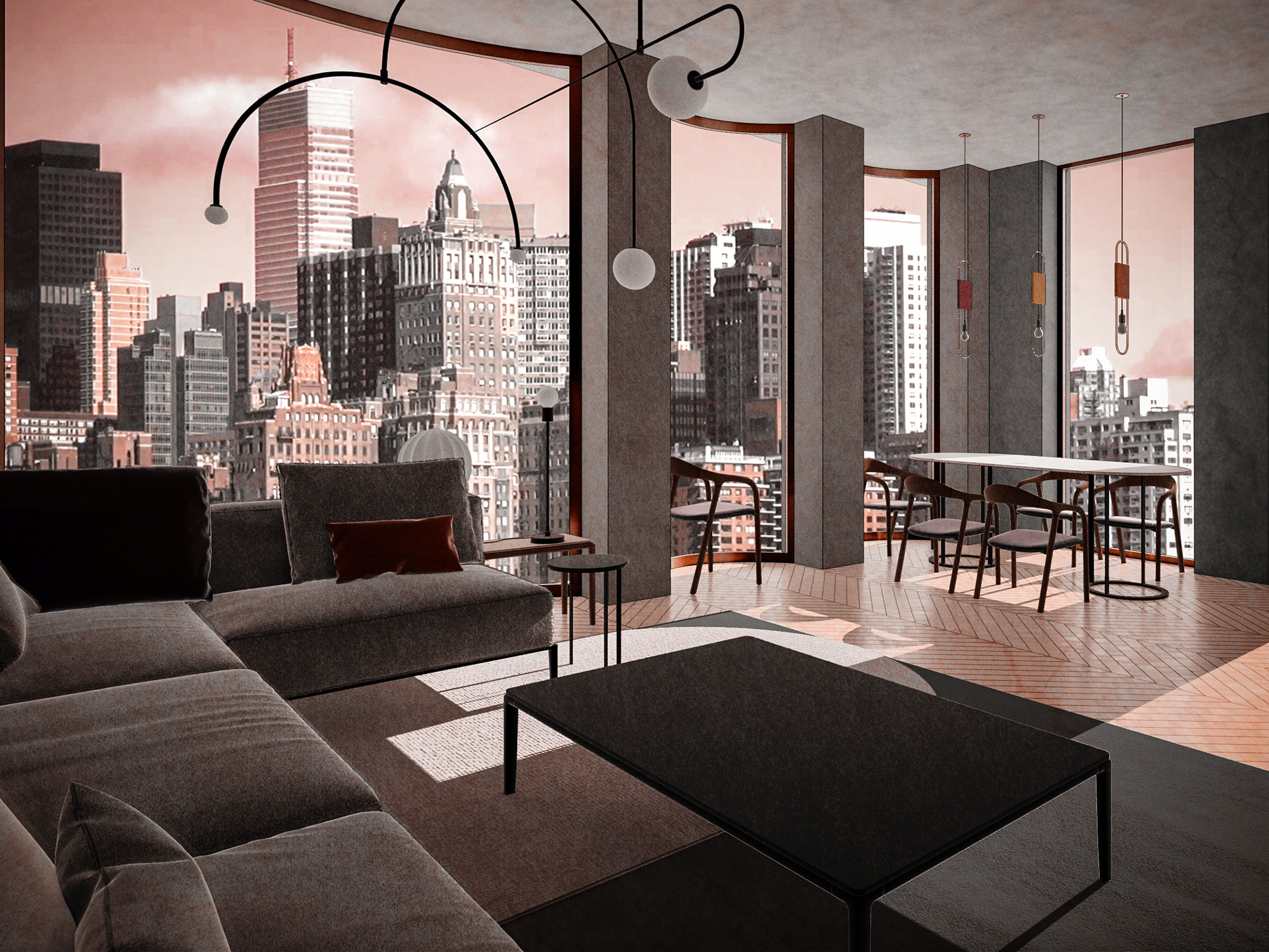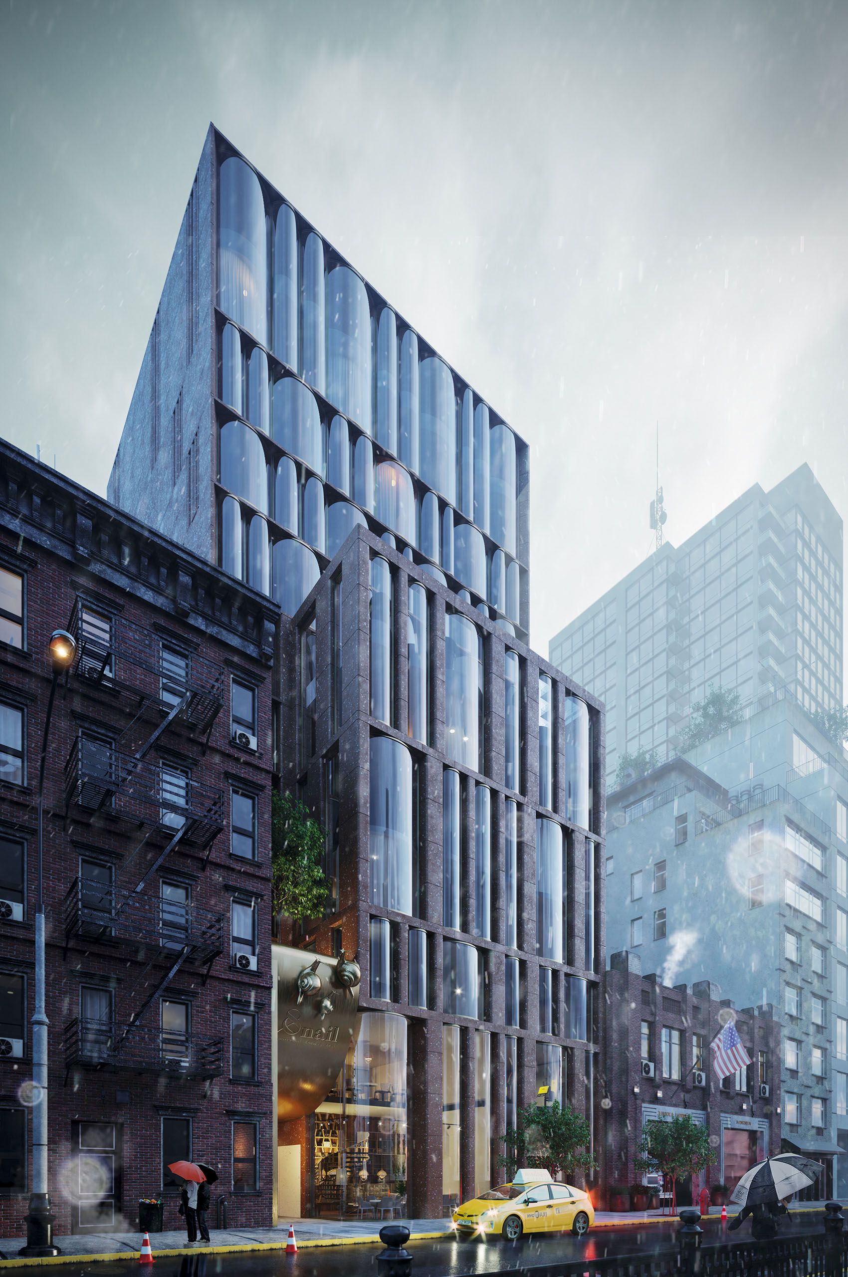 Расскажу немного о том, как формировался архитектурный образ Snail-apartments: свои требования диктовала сама локация, среда. Наш объект расположен на типичной для Манхэттена довольно оживленной и шумной днем улице. Поэтому нижняя часть фасада (первые четыре этажа) несет двойную функцию. Благодаря толстым простенкам она выглядит как визуальная защита, апеллируя к архетипу «стеновой архитектуры», главная роль которой — в создании безопасного убежища. Одновременно довольно массивные стены защищают внутренние пространства от уличного шума. Верхняя часть здания — более воздушная, с большим объемом остекления. Это уже отсылка к современной архитектуре Нью-Йорка и возможность раскрыть обзор на живописные виды за окном. Индивидуальность визуальному образу здания придает прежде всего оригинальное остекление — окна с гнутым, моллированным стеклом.