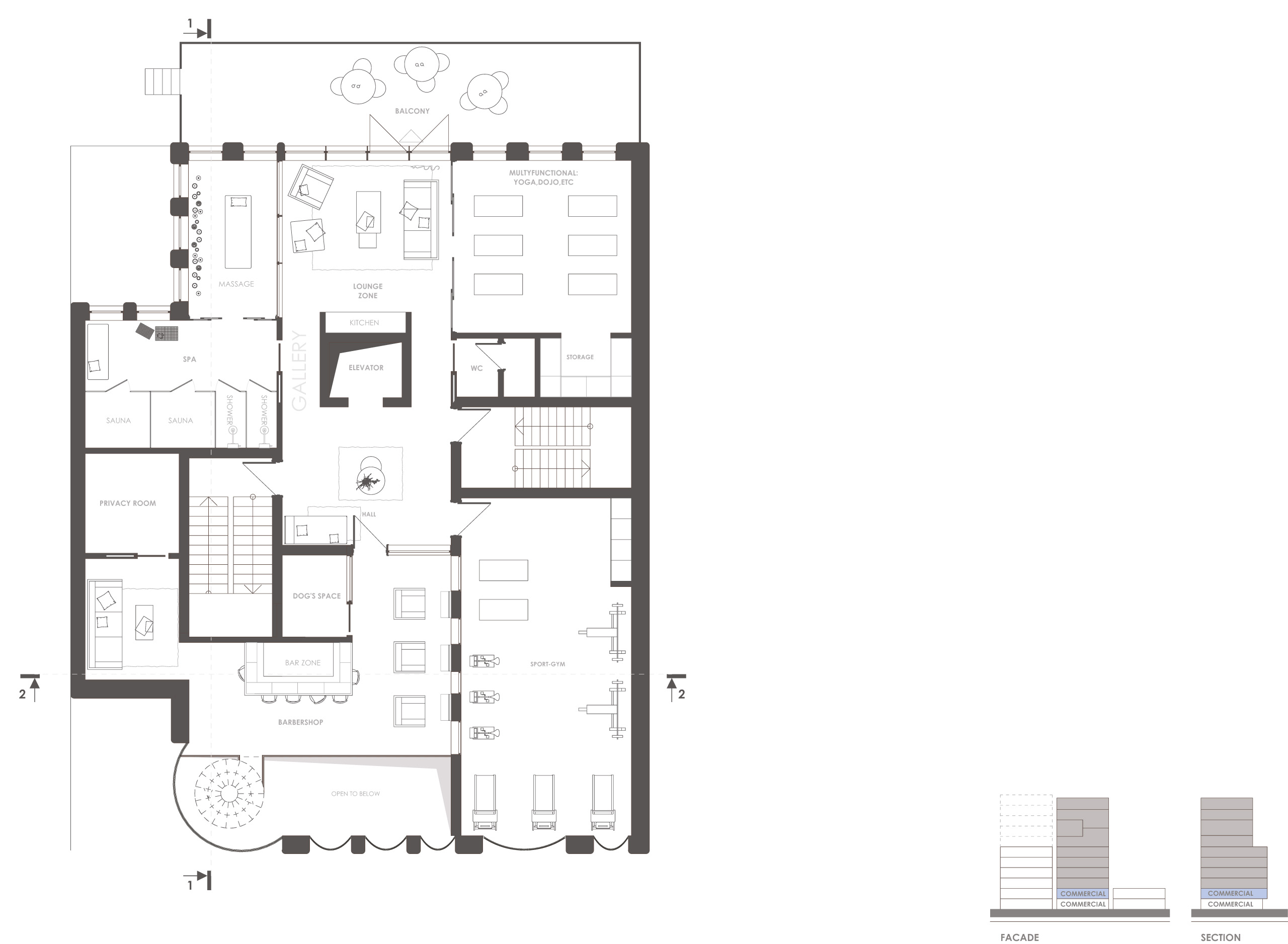 Мы пытаемся размыть границу между private и public, между личным и общественным. На Манхэттене традиционно эта граница очень жесткая, и баланс не в пользу общественного. Public — это по сути улица, зона от метро до дома, она функциональна, но минимально комфортна. В Европе цель публичного пространства — создать качественную среду для всех, и к этому мы уже привыкли. А в Нью-Йорке публичное пространство дает тебе минимум. Если у тебя есть деньги, то ты будешь наслаждаться комфортом, вернувшись с улицы в личное пространство, но если ты по местным меркам недостаточно обеспечен, то функциональный минимум — это все, на что можешь рассчитывать. Мы хотим попытаться сместить этот баланс. Да, блок первых двух этажей комплекса — это «домашняя» среда, одновременно открытая и для гостей. Из кафе на первом этаже можно подняться в небольшой барбершоп с барной стойкой. Мастер работает днем, а вечером кресла можно развернуть, и они превращаются в дополнительные места в баре. Мы предусмотрели сигарную комнату, оснащенную мощной вытяжкой, где можно выкурить сигару или кальян. Здесь же — тренажерный зал.
