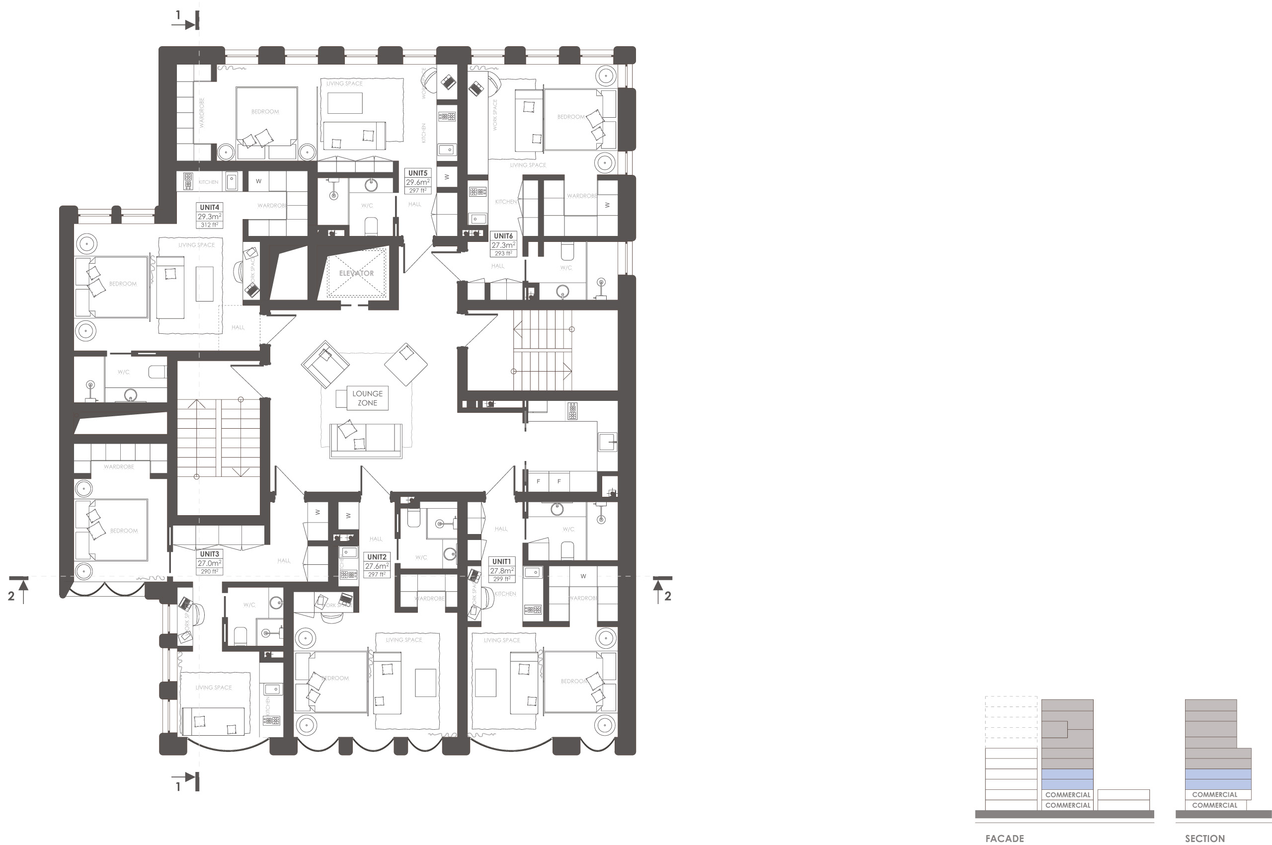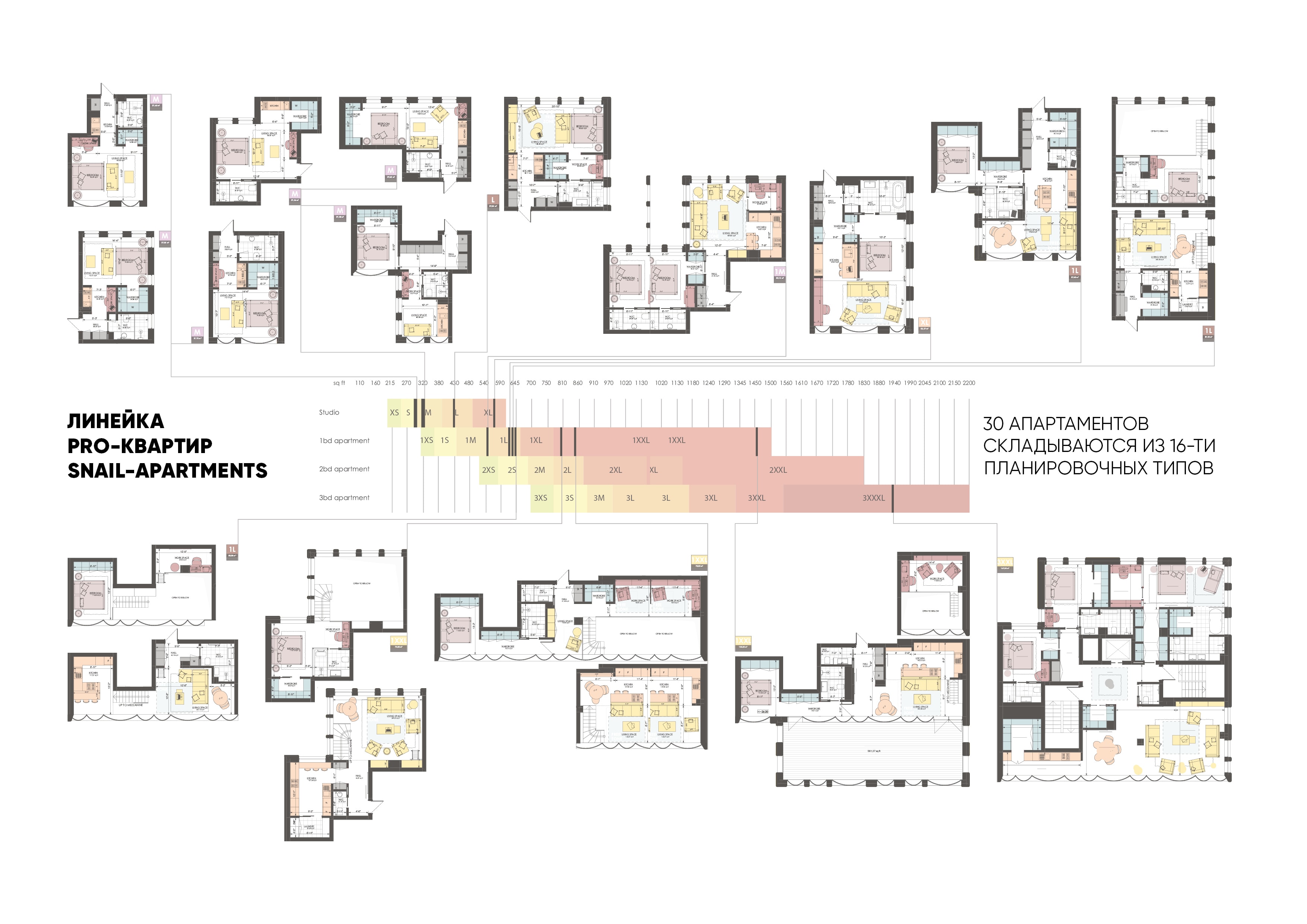 При этом есть обязательное условие: люди не должны мешать друг другу. Нежелательно сталкивать разные социальные группы. Наш жилец — это человек достаточно открытый к контактам с соседями, культурный, определенно креативного склада, возможно, занятый в креативной сфере. 20‑летний специалист может позволить себе студию площадью 27 кв. м, 35‑летний менеджер приобретет квартиру площадью 40—50 кв. м, а состоявшийся 50‑летний руководитель может жить в пентхаусе площадью 170 кв. м. Но эти люди одного культурного уровня, они не мешают друг другу и вполне комфортно чувствуют себя, встречаясь в баре или тренажерном зале. Вот почему у нас такая богатая линейка — от самой маленькой до самой большой квартиры. Для того чтобы жителям было интересно встречать неординарных, но непохожих людей. В Snail-apartments 30 апартаментов складываются из 16‑ти планировочных типов площадью от 27 до 170 кв. м. Каждый уровень — уникален.