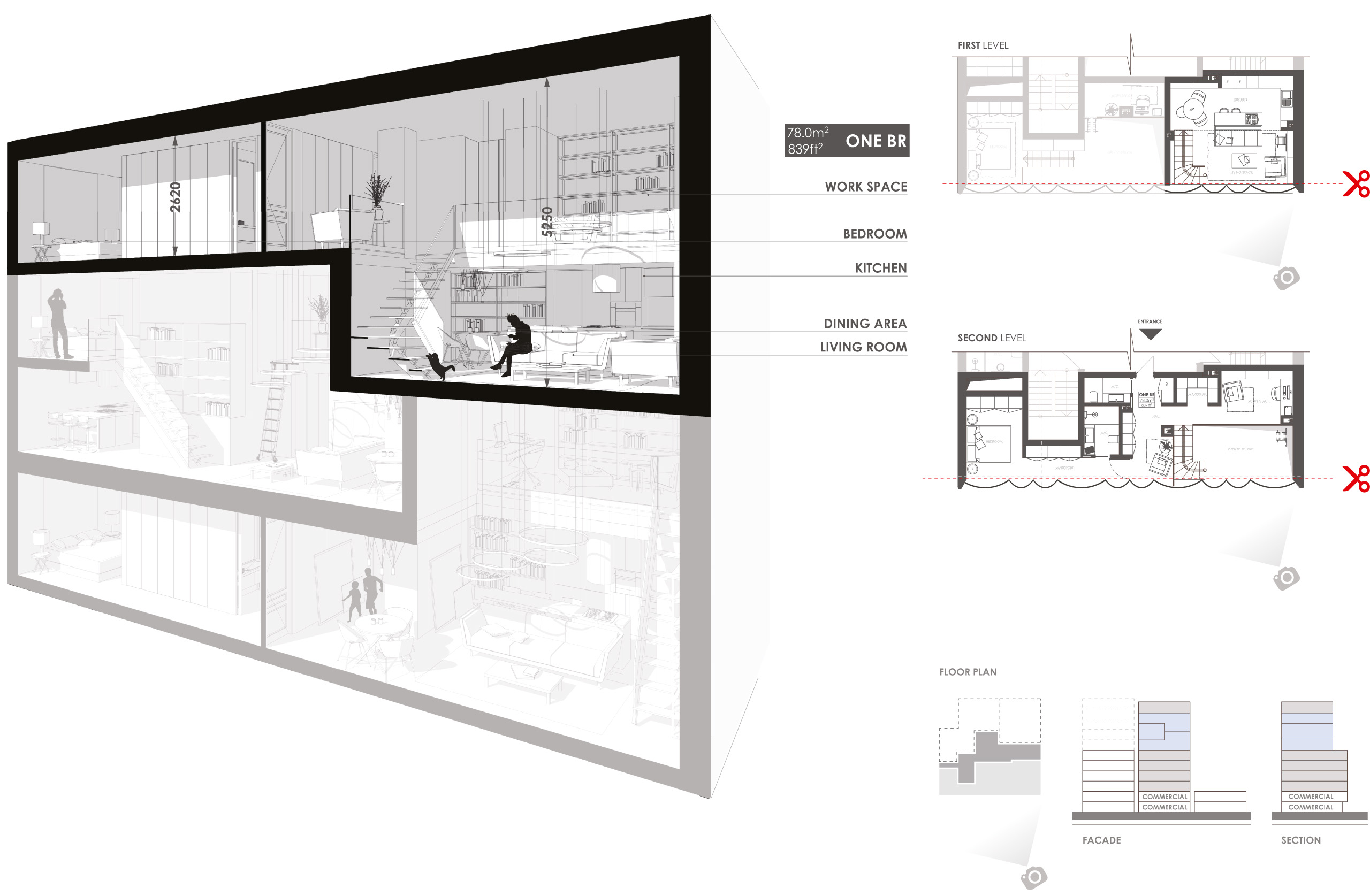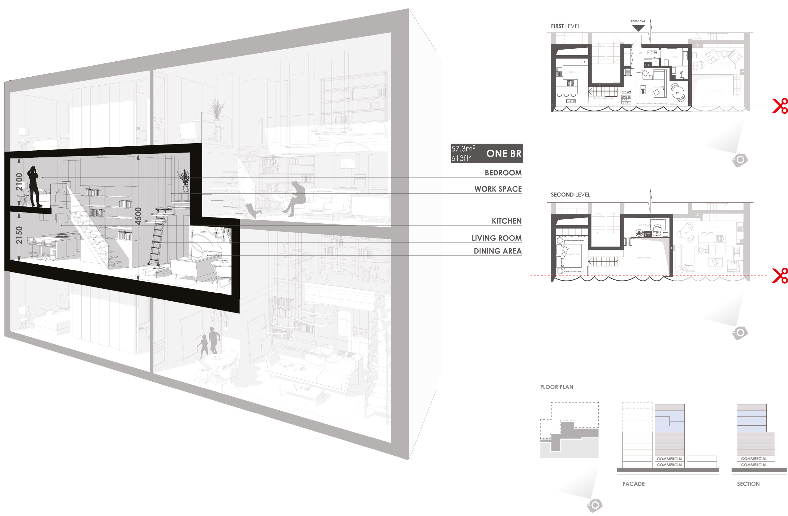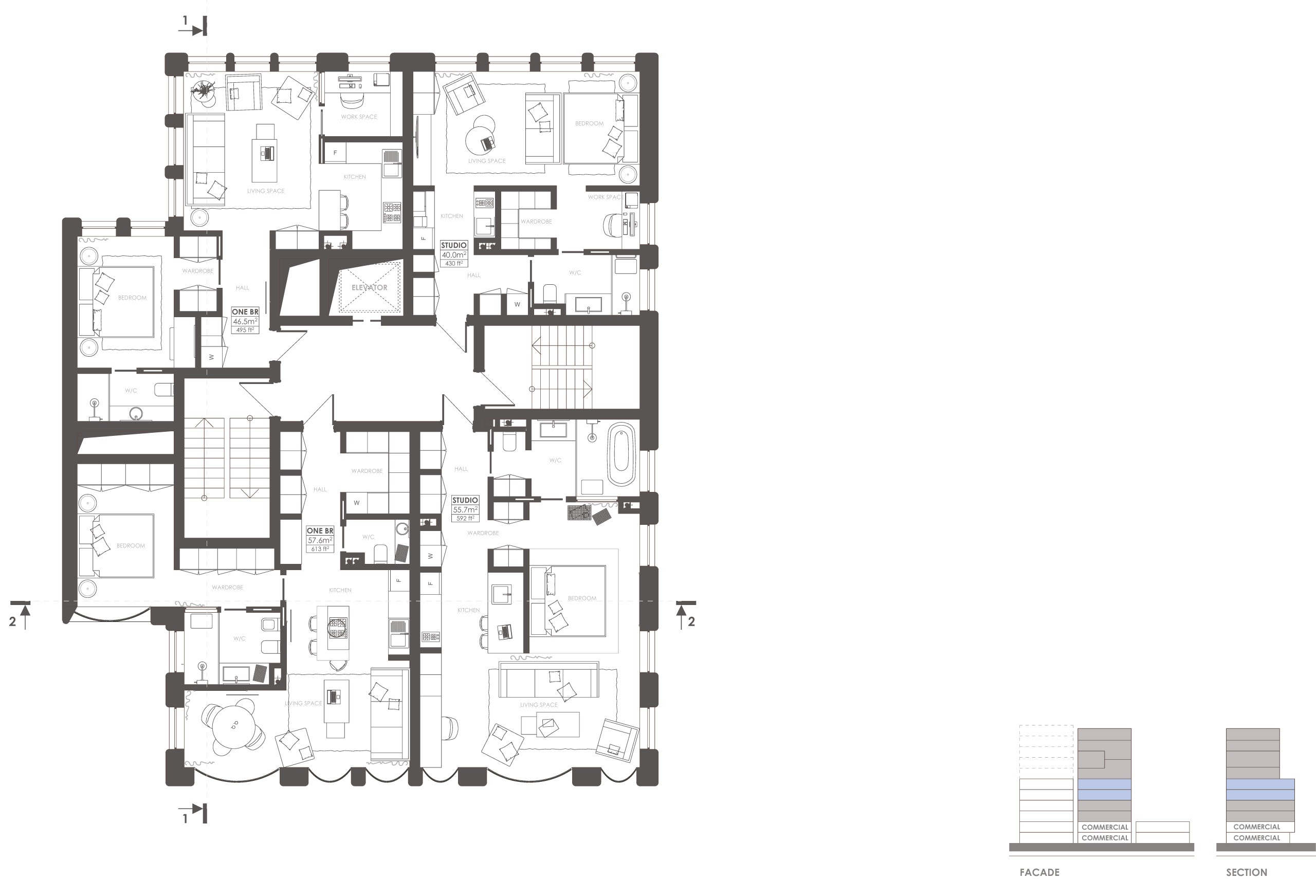 Самые нижние жилые этажи — coliving, некий симбиоз жилья и гостиницы. Это мини-студии, в которых есть кухня с кухонным фронтом всего в 1,2 м, где можно на двух конфорках что‑то разогреть. Чаще молодой человек, живущий и работающий на Манхэттене, не готовит дома, и потому нет смысла тратить на кухонную зону большую площадь. Для того чтобы когда‑то приготовить что‑то серьезное для гостей — есть общая полноценная кухня на этаже. И здесь же предусмотрен лаунж, где можно посидеть с друзьями или пообщаться с соседом. Один из важных элементов: в каждой из квартир предусмотрено рабочее место, потому что фриланс — это актуально. И, конечно, мы предусмотрели большой гардеробный фронт и кровать размера king size, чтобы отдых был комфортным. Можно воспринимать такую небольшую квартирку как гостиничный номер-люкс.