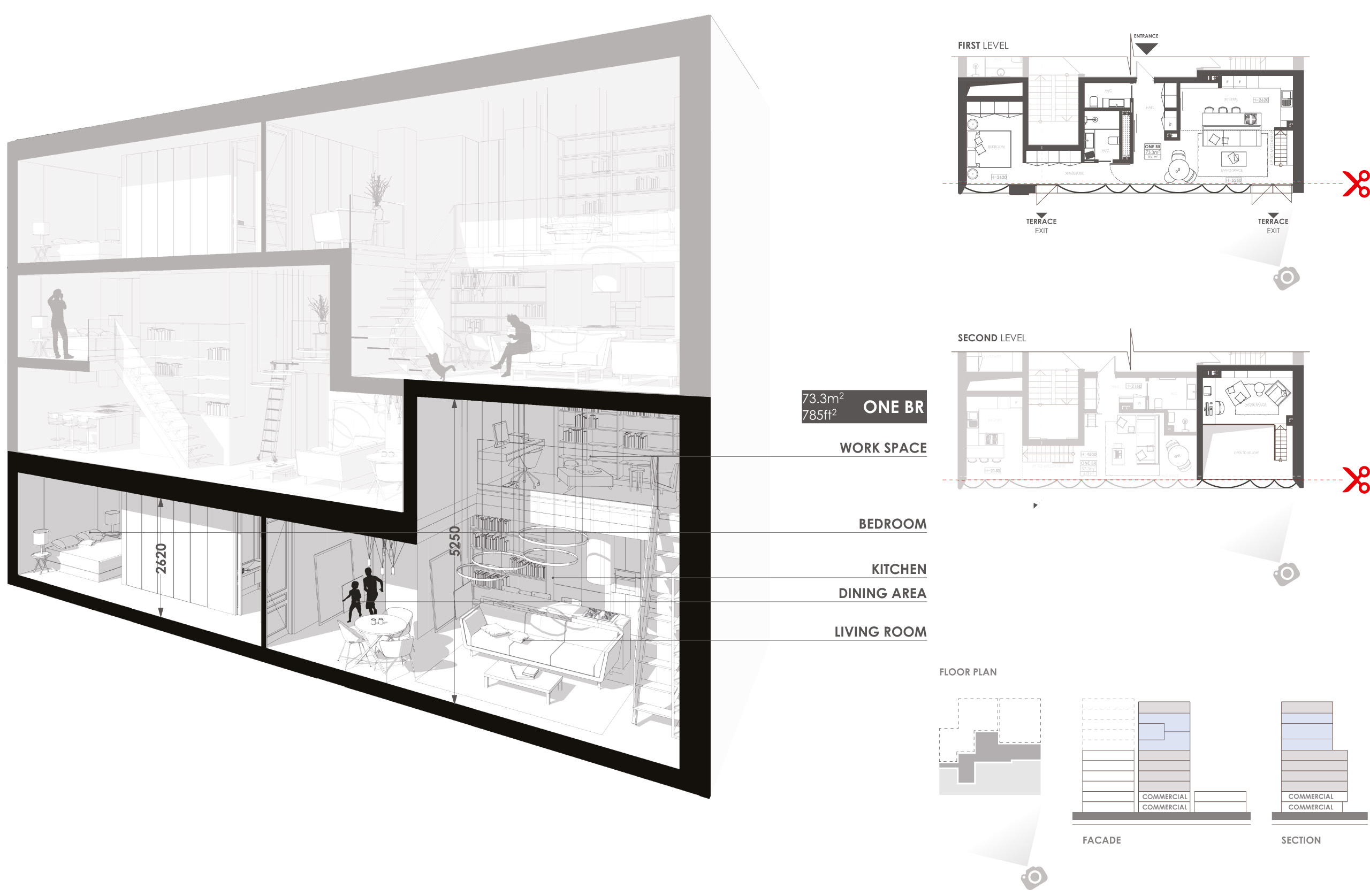 Следующие два этажа — это пять полутораэтажных квартир, одна из которых имеет выход на террасу. Появление террасы продиктовано нью-йоркскими градостроительными нормами. Было необходимо сделать перепад по плоскости фасада, и мы использовали его для расширения площади квартиры за счет обзорной террасы с шикарным видом.