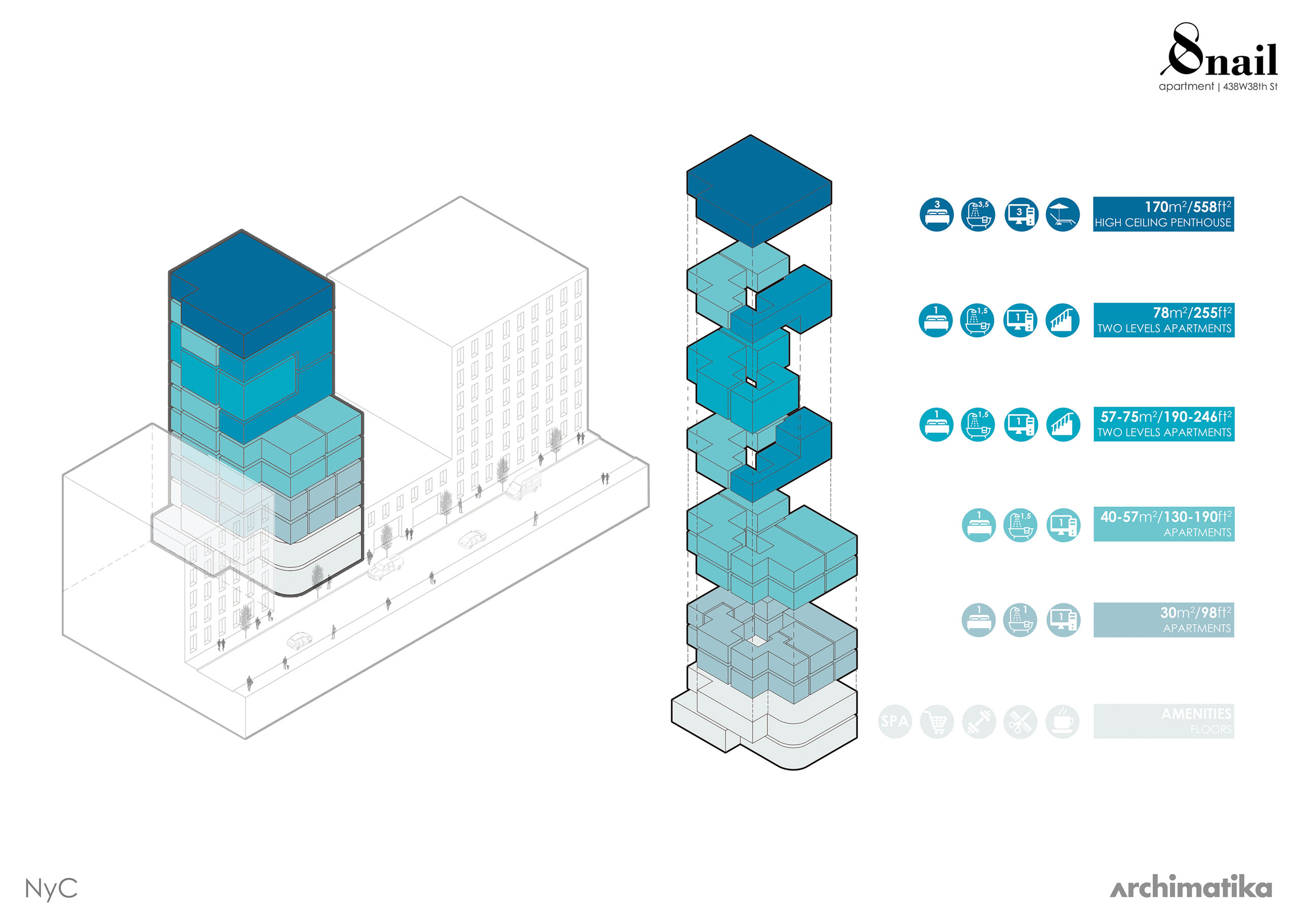 Пропорции и высота здания Snail-apartments соответствуют жестким градостроительным нормам Нью-Йорка. Источник изображения: аrchimatika, 2019 г.