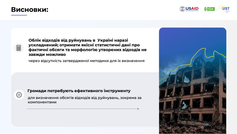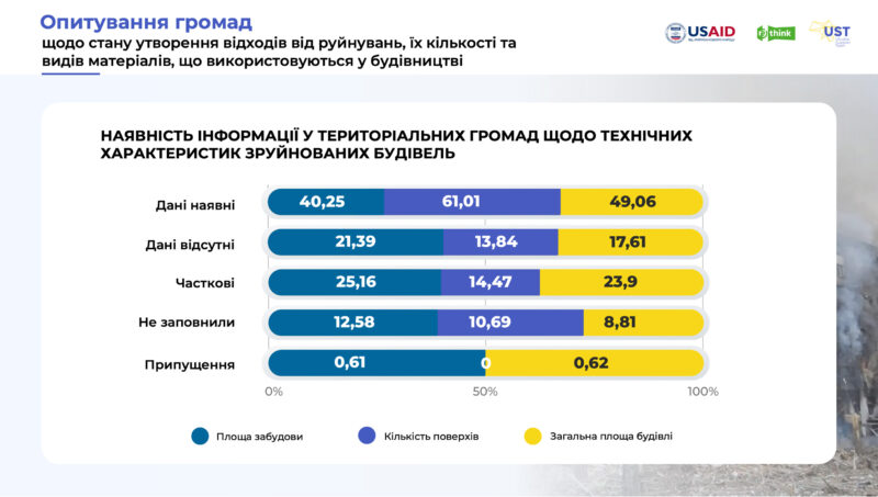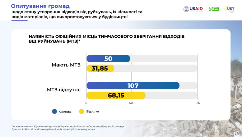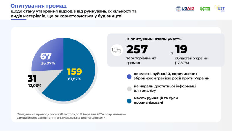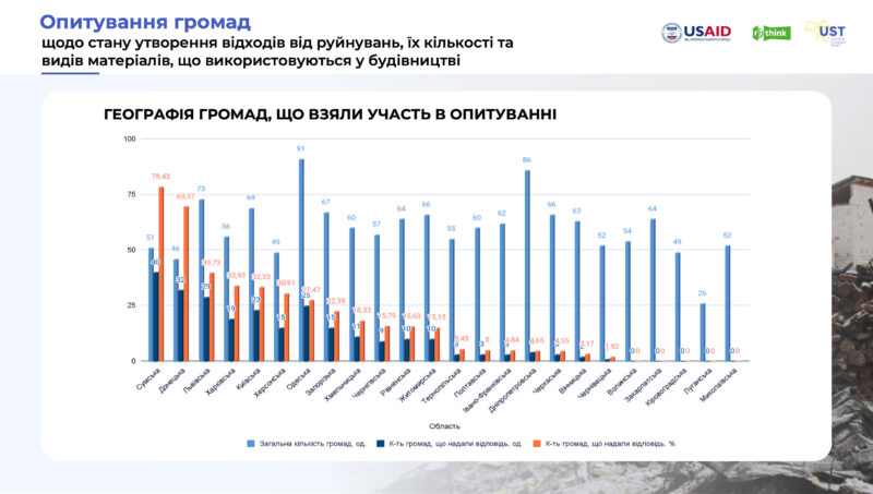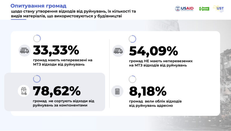 Поки що результатами, схожими на ті, яких вдалося досягти жителям Киїнської громади, може похвалитися дуже мало об’єднань. Станом на зараз більшість громад не тільки не розсортували сміття, але й не оцінили масштабів руйнувань: згідно з результатами опитування, проведеного ReThink, лише половина адміністрацій уже підрахували загальну площу пошкоджених будівель. Інформацію про кількість відходів від руйнувань пооб’єктно (адресно) зафіксували тільки 13 зі 159 громад. Решта або не мають повної інформації, або ще не рахували, або висловили припущення чи сказали, що втратили дані через бойові дії.