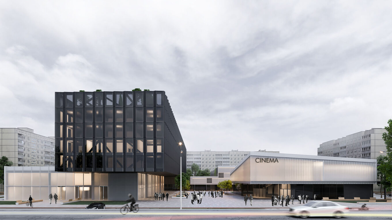 Проект С74 в номинации «Создание концепции комплекса зданий с кинотеатром» в Голосеевском районе Киева, визуализация