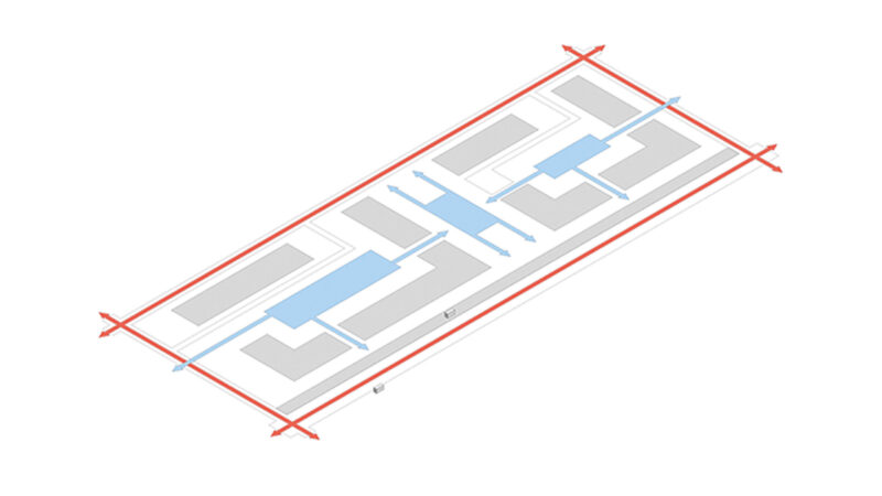 ТРЦ организован по принципу пассажа и имеет три входа. Для офисного этажа архитекторы предложили три варианта: с коридорной системой, с тремя самостоятельными арендными площадками и полностью открытый офис во весь этаж. Большим преимуществом для всех сценариев являются ограждающие конструкции из оконных блоков по всему периметру, что дает возможность организовать максимум хорошо освещенных рабочих мест.