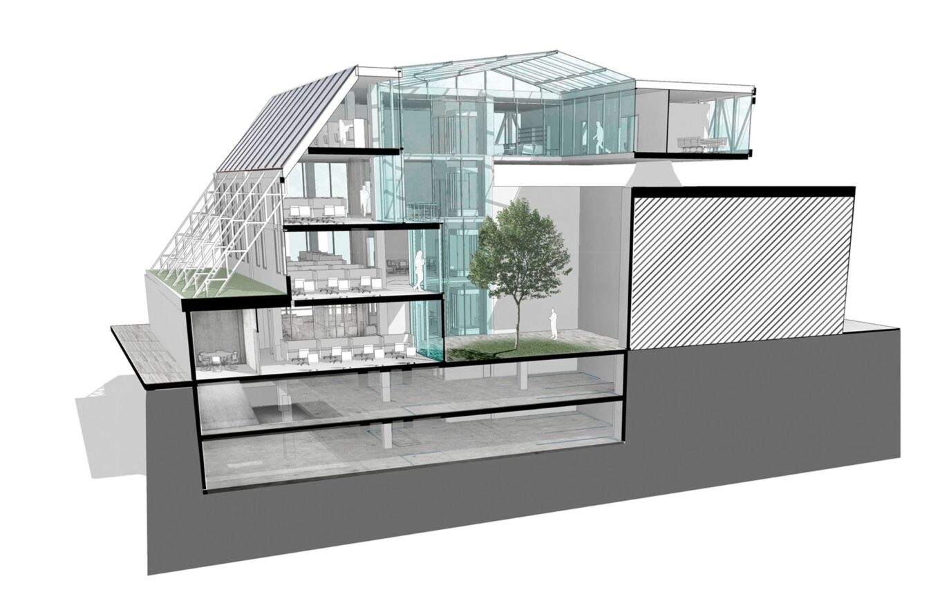 Авторы проекта предложили возвести на выделенном под застройку земельном участке трехэтажное офисное здание с атриумом. Идея была в том, чтобы устроить работникам офисов собственное рекреационное пространство.