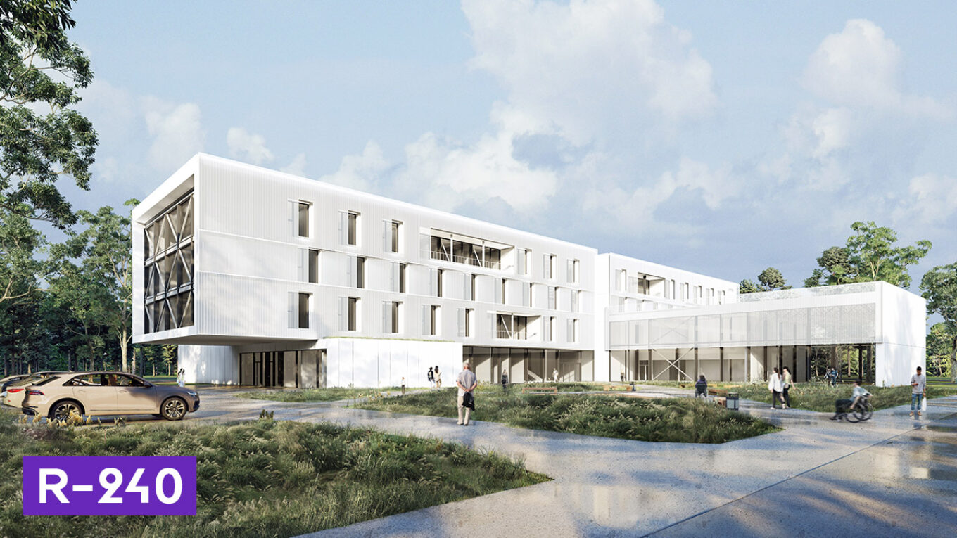 R-240 — проєкт реабілітаційного центру для військовослужбовців і ветеранів війни в м. Житомир, Україна. Автори проєкту — Дмитро Мазур, Софія Лейбич, Софія Кійко, Ярослав Іваськів та Олександр Мицик, куратор групи — Леонід Вознюк. Зображення надане авторами проєкту