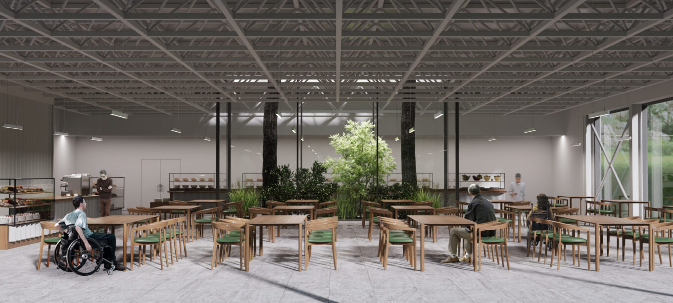 - Реабілітаційний центр — це простір, який максимально орієнтований на маломобільні групи населення. На відміну від інших типів будівель, де архітектори можуть просто пристосувати свій проєкт під потреби людей з обмеженою мобільністю, реабілітаційний центр вимагає врахування інклюзивності в прийнятті всіх рішень із самого початку проєктування. Спираючись на ці судження, під час розроблення концепції ми виділили для себе основне завдання — створити максимально зручне і просте планування для пацієнтів нашого центру. Ми намагалися передбачити основні шляхи руху для рутинних сценаріїв пересування (наприклад, палата — їдальня, палата — кабінет лікаря — зал для реабілітації та ін.) й максимально зменшити протяжність і складність цих шляхів.