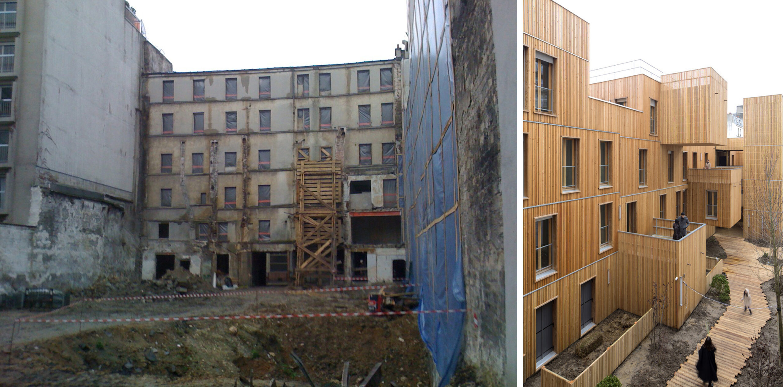 Tête in L’air у Ла Шапель — перший житловий проєкт у Парижі, повністю побудований із деревини. Фото заднього двору та попередній стан будівлі. Фото: ©Cécile Septet, archdaily.com