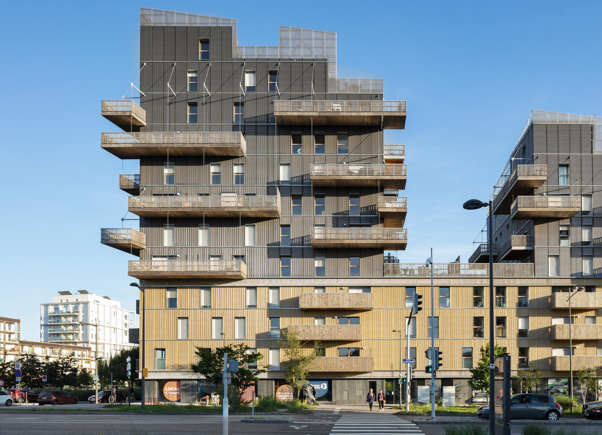 Ще один проєкт KOZ Architectes, який Ніколя Зізель продемонстрував аудиторії, — це 11-поверховий житловий комплекс Sensations у Страсбурзі, визнаний найвищим повністю дерев’яним будинком у Франції та одним із 10 у світі, згідно зі статистикою CTBUH. Будинки із CLT-панелей (Cross-Laminated Timber. — Прим. ред.) зі 146-ма квартирами та комерційними приміщеннями було завершено у 2019 році. Конструкції не містять бетону за винятком фундаменту та першого поверху, позаяк там розташовані магазини.