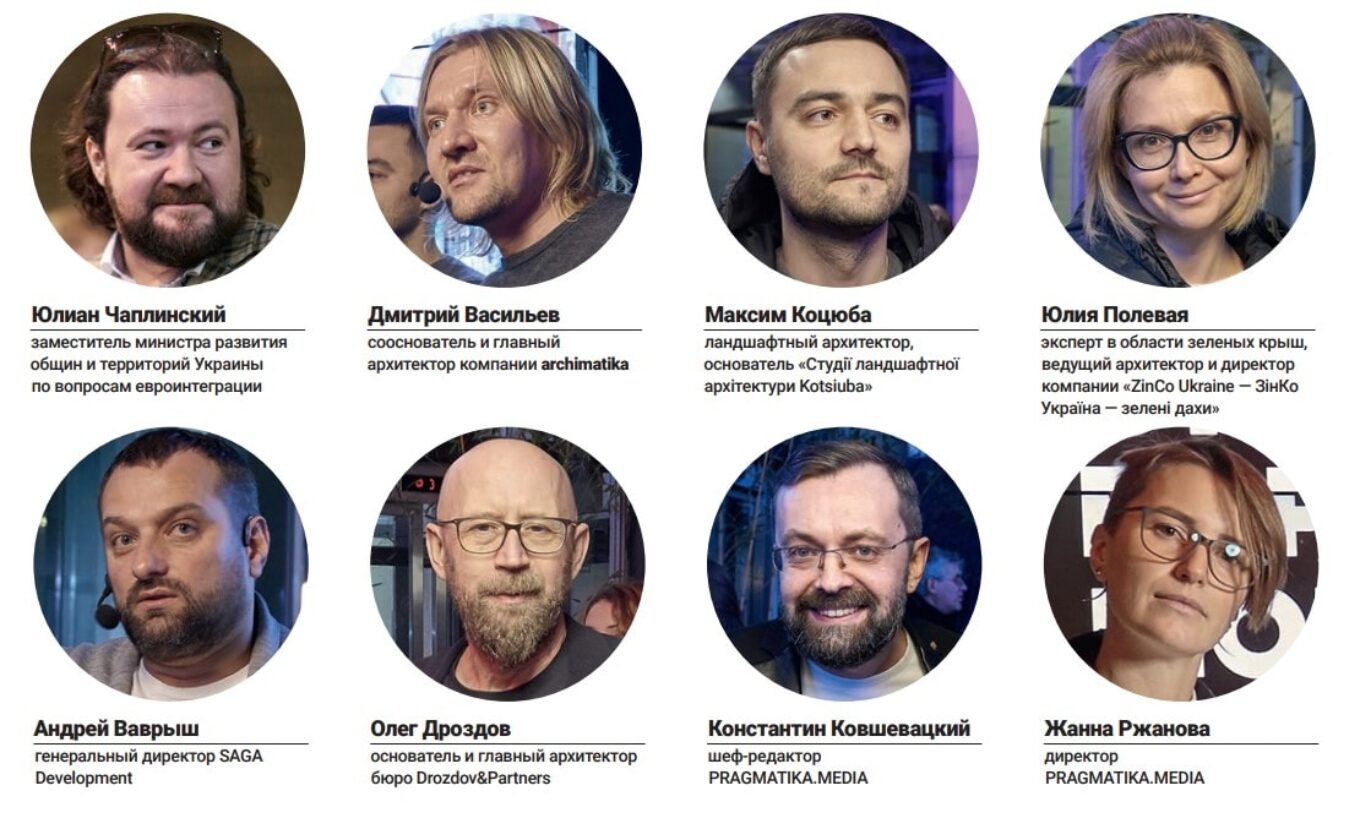 Нашими спикерами стали Юлиан Чаплинский, заместитель министра развития общин и территорий Украины по вопросам евроинтеграции; Дмитрий Васильев, сооснователь и главный архитектор компании archimatika; Максим Коцюба, ландшафтный архитектор, основатель «Студії ландшафтної архітектури KOTSIUBA»; Юлия Полевая, эксперт в области зеленых крыш, ведущий архитектор и директор компании «ZinCo Ukraine — ЗінКо Україна — зелені дахи»; Андрей Ваврыш, генеральный директор SAGA Development; Олег Дроздов, основатель и главный архитектор бюро Drozdov&Partners. Модераторами выступили шеф-редактор PRAGMATIKA.MEDIA Константин Ковшевацкий и директор издания Жанна Ржанова.