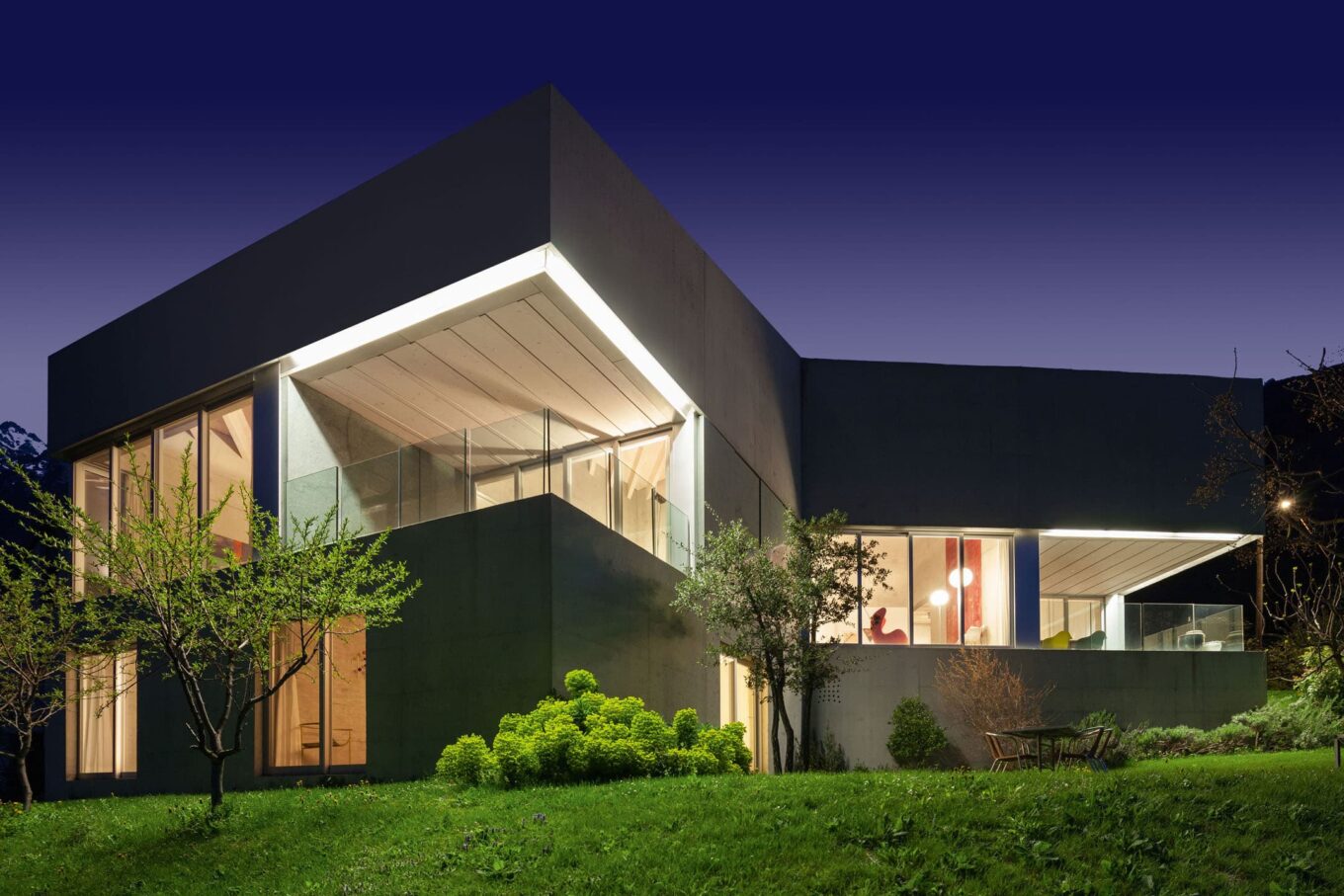 Внимание к темным профилям обусловлено спросом на алюминиевое остекление. Это прочный и высокотехнологичный материал, применимый в широком спектре категорий остекления. Тонкие профили, повышенные несущие свойства, долговечность конструкций — само собой, это более дорогой ценовой сегмент. Но в ходе разработки проекта порой случается так, что в одной зоне подобное решение необходимо (скажем, для установки панорамного фасада или раздвижной системы с большой площадью стеклопакетов), а в другой ПВХ-профили прекрасно справляются с поставленными задачами. Повышенные затраты, равно как и экономия, уместны ситуативно, поскольку любая постройка неоднородна в своих функциях и требованиях к материалам.