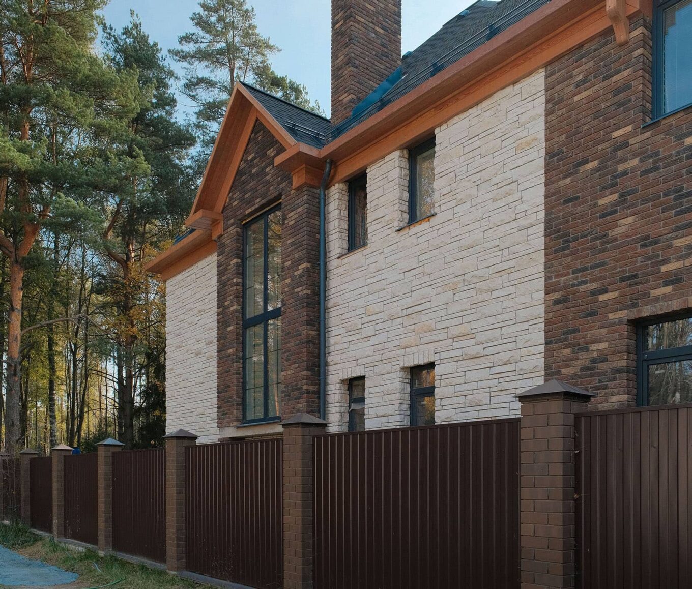 В качестве альтернативы для отделки декоративных элементов можно использовать натуральные текстуры камня и дерева, но профили окон оставить темными. Подобные оттенки не конфликтуют с общим фасадом, но при этом в оформлении интерьеров более универсальны