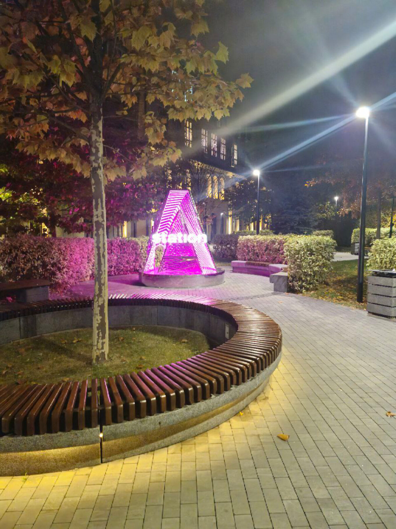 Говорячи про підсвітку артоб’єктів на території комплексу, Олександр Максимов відсилає нас до вже раніше згаданих ним ліхтарів загального освітлення: «Сама по собі ідея доповнити простір A-Station скульптурами й артоб’єктами є цікавою, та в подібних випадках варто бути дуже уважним як до розрахунків характеристик світла, так і до розміщення самих об’єктів. Якщо бодай один із цих критеріїв має серйозну погрішність, це призводить до так званого світлового забруднення простору. Неправильно розміщений та освітлений артоб’єкт не додає локації розмаїття — натомість він хаотично зміщує фокусні точки, видається в просторі зайвим, недоречним, таким, що простір перевантажує. Якщо ми маємо справу з візуальним акцентом, він повинен відповідним чином виділятися за рахунок яскравості освітлення. В цьому ж випадку з кольоровою підсвіткою скульптур конкурують уже згадані раніше ліхтарі вздовж доріжок. Якби вони були вищі чи нижчі, це не видавалося б умовним протистоянням двох джерел світла. Однак за такої висоти ліхтарів відносно скульптур це виглядає саме так».