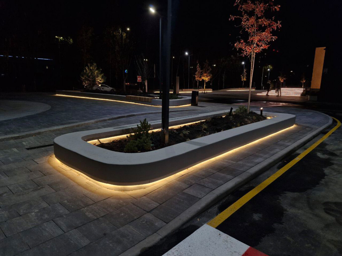 Критикувати легко, та ми ставимо собі за мету не просто вказати на недоліки, а й розібрати альтернативні способи вирішення проблеми. В цьому випадку, з огляду на комерційний характер комплексу, світловий сценарій освітлення пішохідної зони сприймався би більш органічно, якби верхнє світло зробити більш приглушеним, знизити яскравість до 10–15 люкс із теплішим відтінком, а основну підсвітку доріжок дати на рівні ніг, аби вона не била в очі».