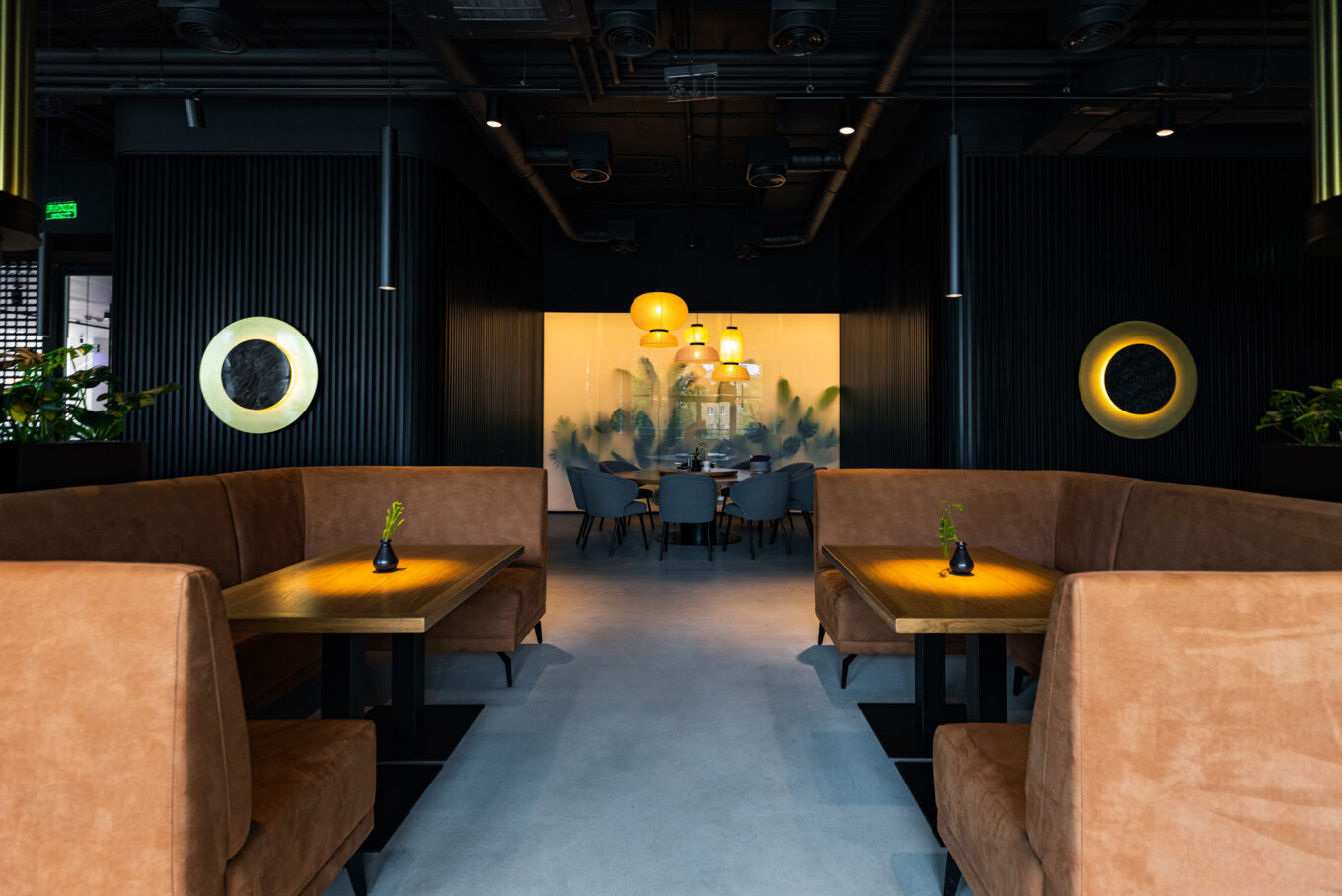 Вузькі кути свічення, спрямовані виключно на столи, додають просторам атмосферності, а фонове освітлення холів підкреслює відчуття глибини та розмірності інтер’єру.