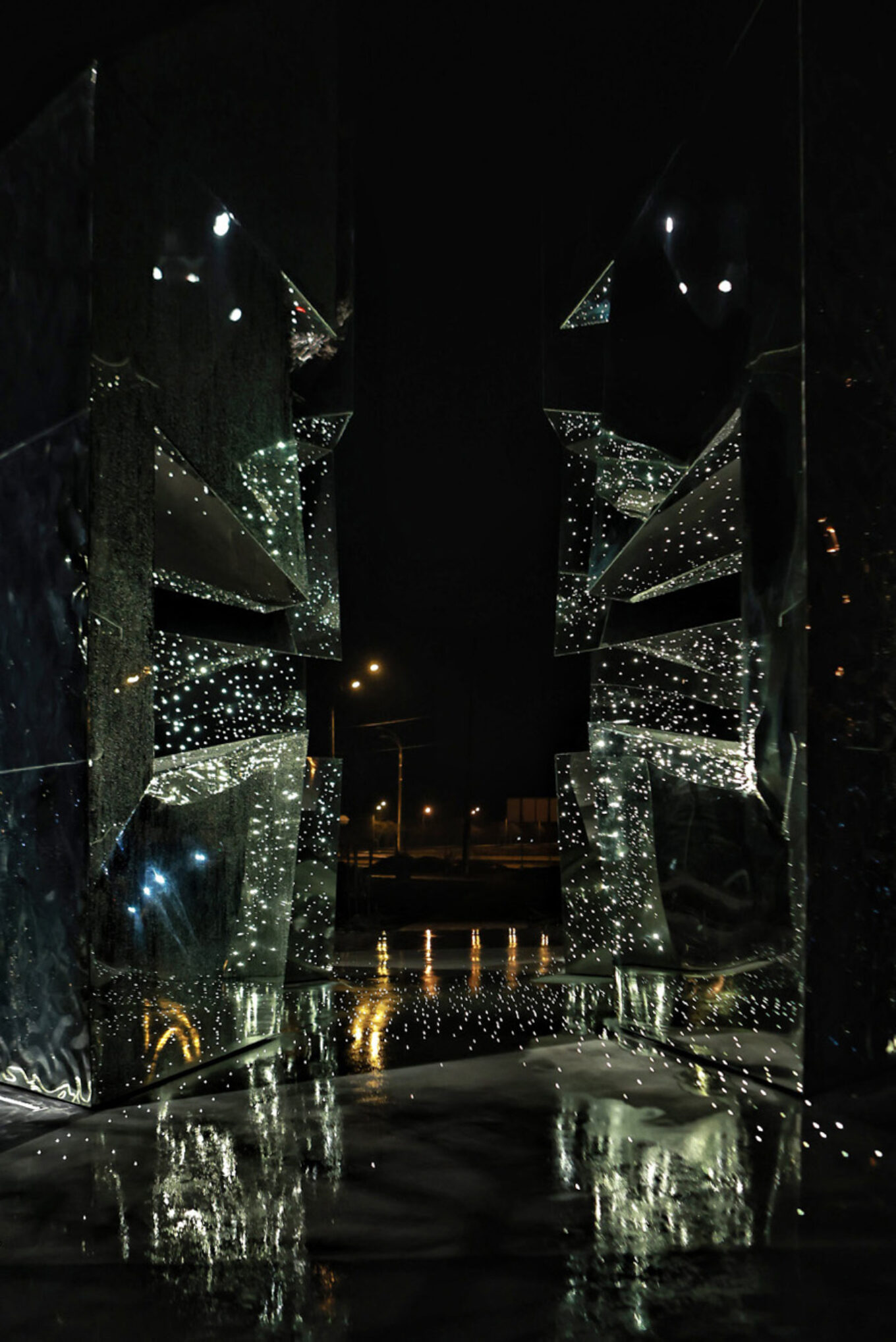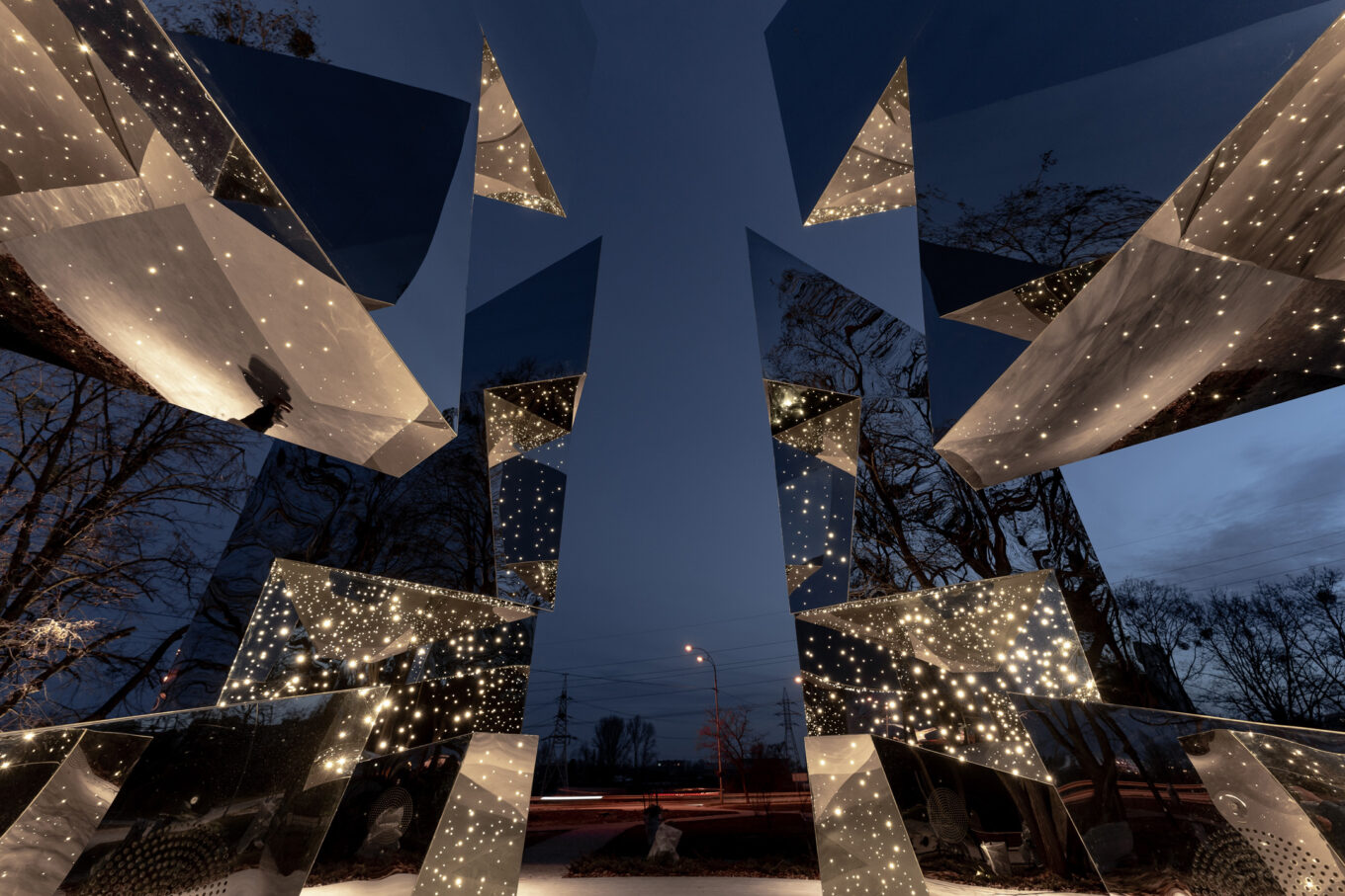 Вид на меморіал із погляду людини, яка перебуває всередині вночі. Зображення надане Kabluka Light & Digital Sculptures