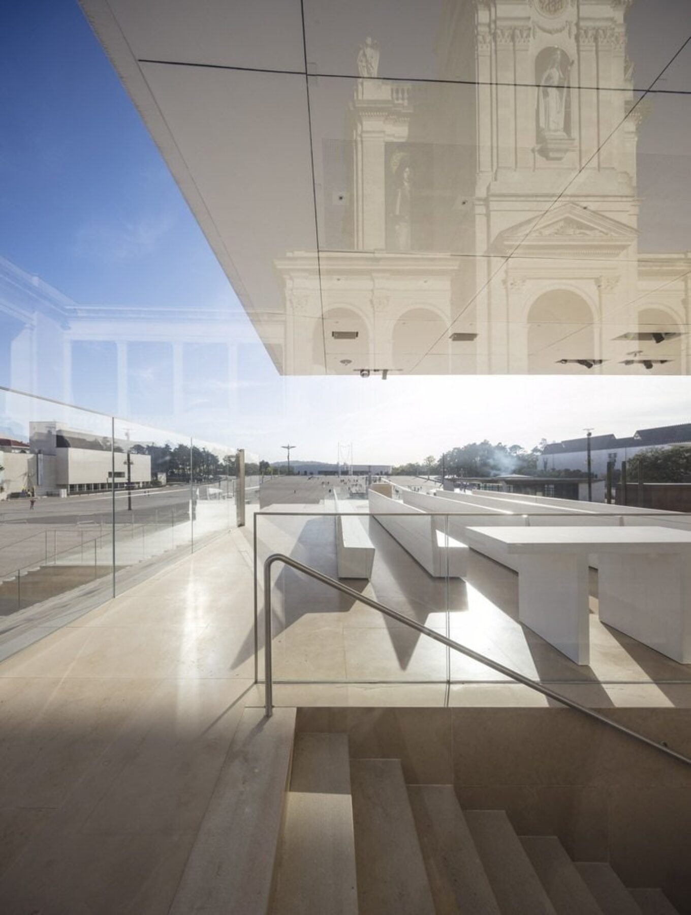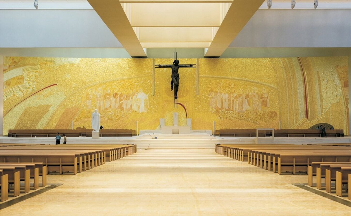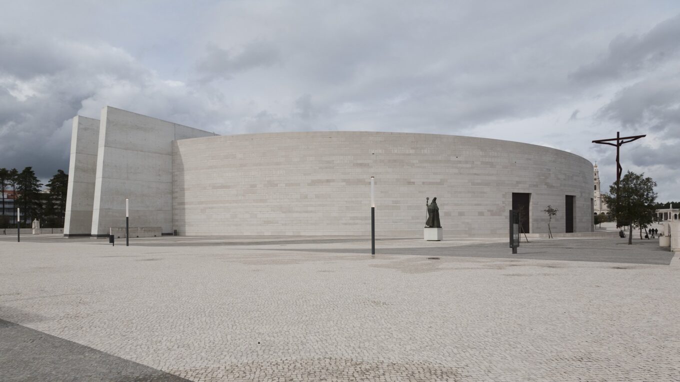 Португальская архитектор Паула Сантос спроектировала внешний архитектурный алтарь, интегрировав его в комплекс лестниц. Алтарь и хор, где проходит служба, защищает навес площадью в 600 квадратных метров. Стекловолоконная плоскость с белоснежным покрытием (белый – официальный цвет всех церквей в Португалии) опирается всего на один лаконичный блок из белого бетона.