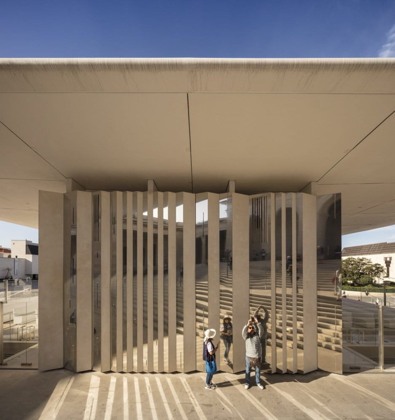 В основе простого, на первый взгляд, минималистичного дизайна, заложены современные функциональные качества – навес укрывает от солнца священнослужителей, обеспечивая также исключительную акустику, а за декоративными зеркальными ширмами скрыты технические коммуникации и вход в подземные ризницу и часовню.