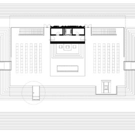 В основе простого, на первый взгляд, минималистичного дизайна, заложены современные функциональные качества – навес укрывает от солнца священнослужителей, обеспечивая также исключительную акустику, а за декоративными зеркальными ширмами скрыты технические коммуникации и вход в подземные ризницу и часовню.
