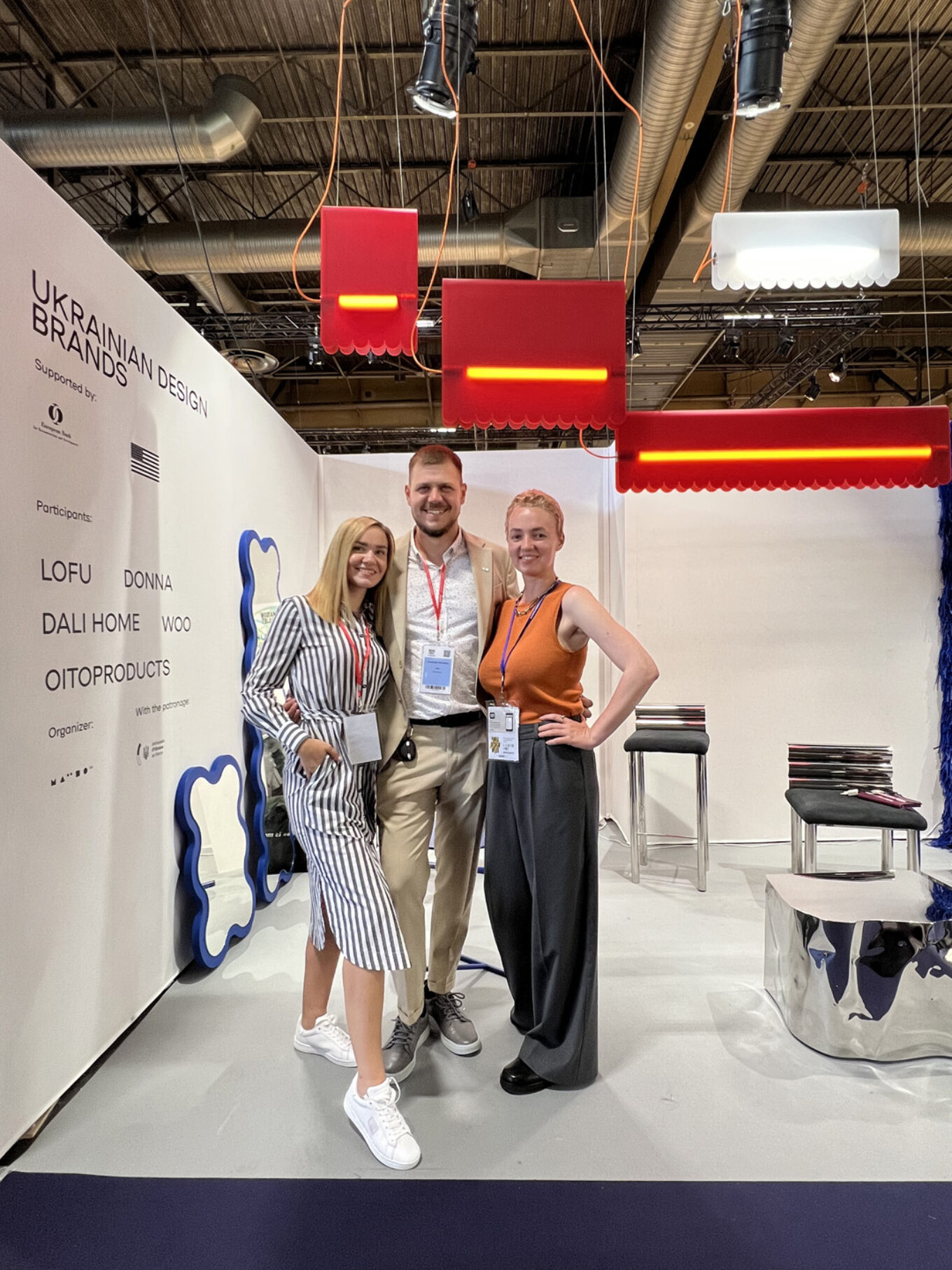 Зліва направо: бренд-менеджерка LOFU Анжеліка Анісімова, засновник LOFU Олександр Максимов і дизайнерка Марія Целік на фоні світильників NAЇVE, фото з виставки Maison&Objet 2022, Париж, Франція