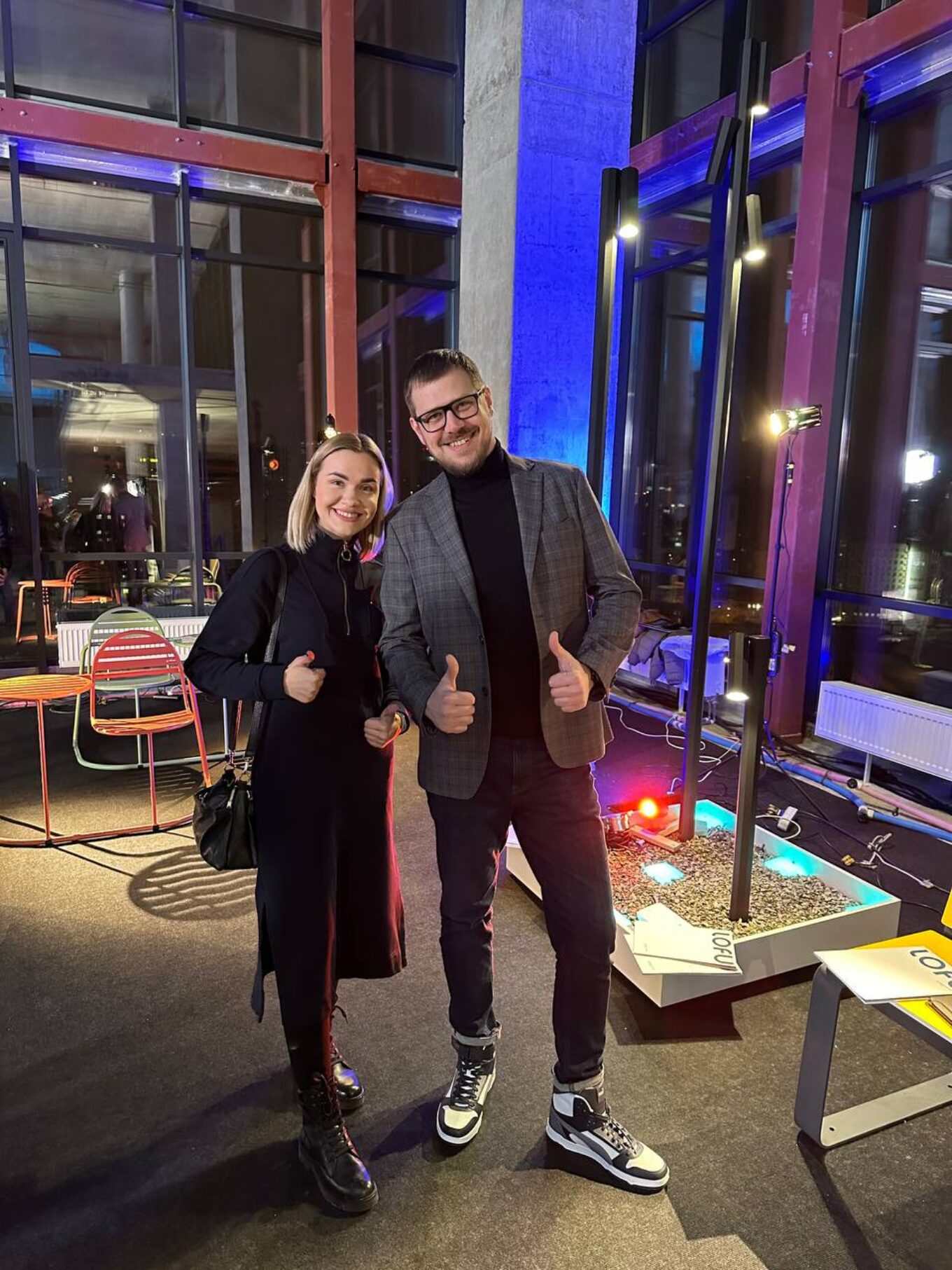 Марія Целік та Олександр Максимов на заході в рамках тижня сучасного українського промдизайну DWRZ Design Days 2023 року. В кадрі – світильник з колекції NAЇVE від LOFU, дизайн – Марія Целік