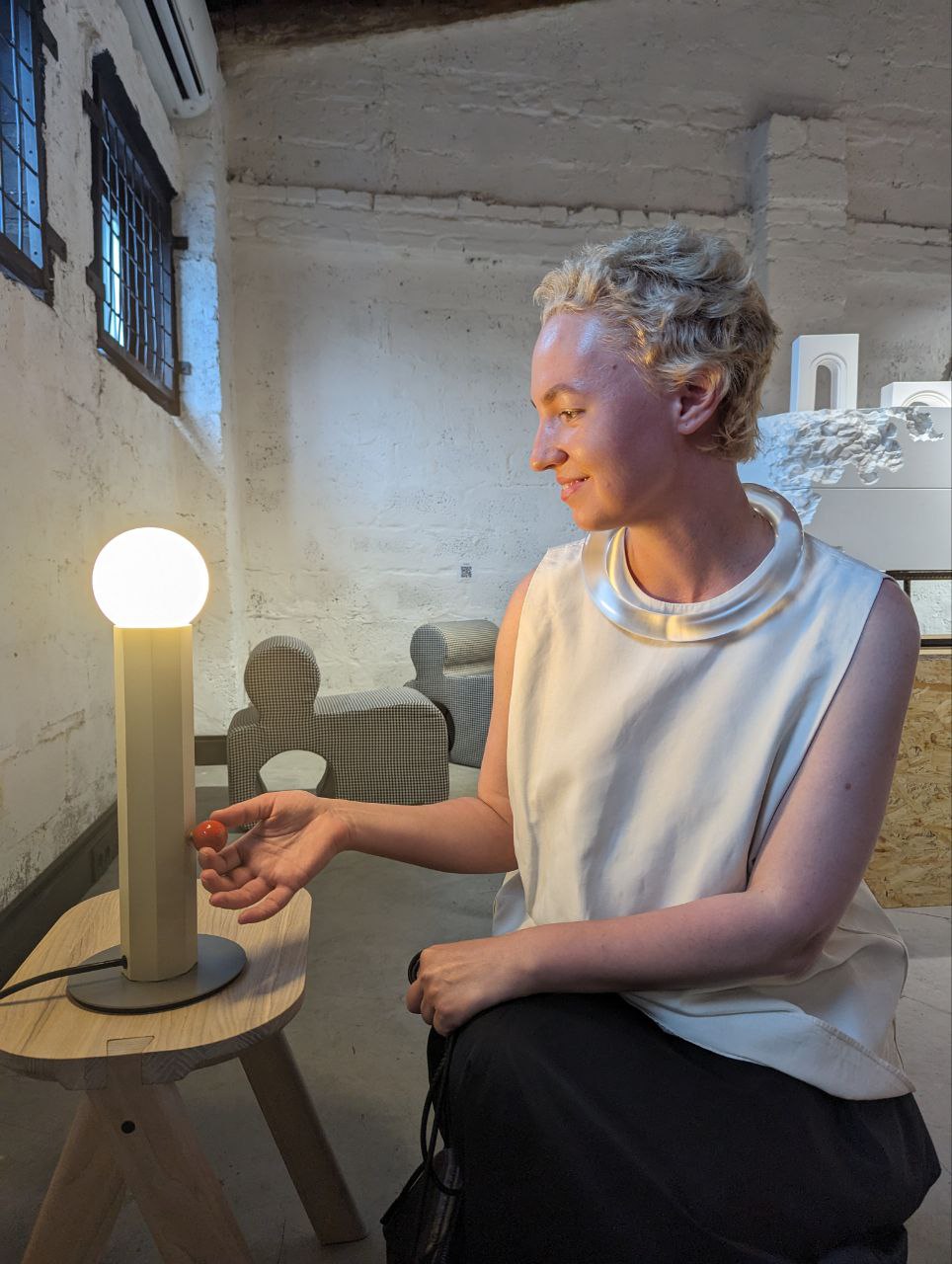 Дизайнерка Марія Целік з настільним світильником із колекції PRYKRASHENA на DWRZ Design Days 2023 року