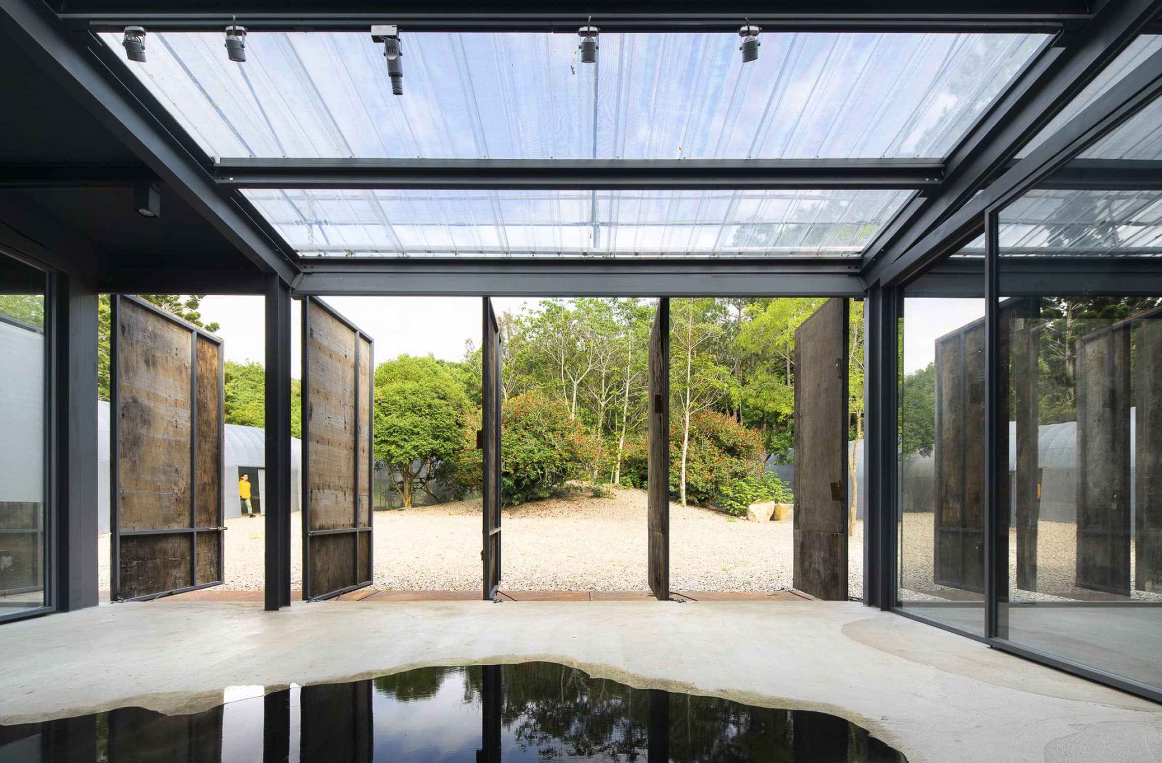 Фронтальная часть структуры The Forest BIG открывается в сад через вращающиеся створки из соснового вторсырья. Другие же области покрыты мерцающими панелями из поликарбоната.