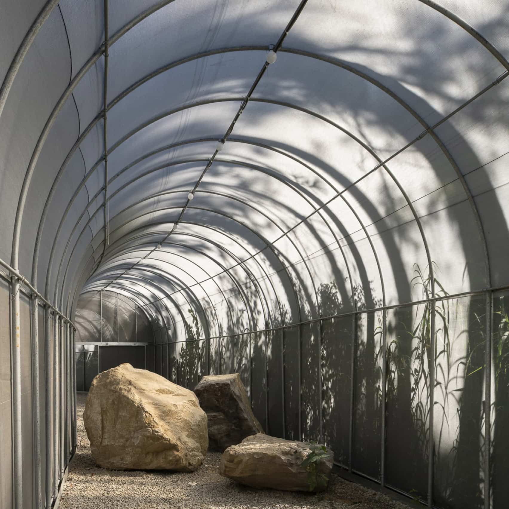 Укрытый сеткой коридор образует кольцевую галерею вокруг остальной части объекта, обозначая его границу. Система туманообразования в паре с сетчатой оболочкой помогают сохранить прохладу внутри. В центре же «очерченного» этим коридором участка располагаются классные комнаты под открытым небом, садовые пространства и пруд.
