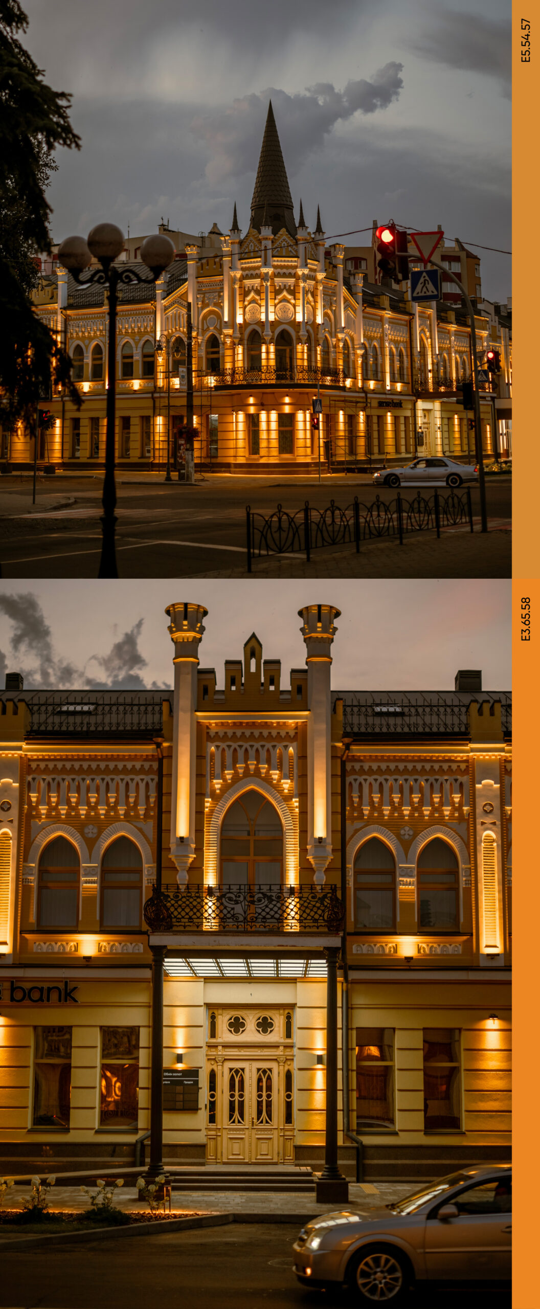 Досліджуючи архітектуру міста, ми зіштовхнулись із певними колірними патернами. Дизайнерка в Citek Studio Наталія Бган-Марченко звертає нашу увагу на зв’язок із природою в колірній гамі історичного фонду: «Це натуральні природні відтінки: білий, сірий, піщаний, блакитний. Тобто всі відтінки Дніпра та пляжу. Вони досить гармонійно співпрацюють один з одним». Звісно, варто вказати будівлю, що є візитівкою міста, — колишній готель «Словʼянський». Це унікальна неоготична споруда кінця XIX століття, створена за проєктом архітектора Владислава Городецького (автора відомого Будинку з химерами в Києві). У різні часи будинок мав сіро-бежевий, а також жовтий колір, відповідно до кольору цегли, з якої був збудований. У радянські часи його перефарбували в блакитний колір, після чого за ним закріпилась назва «Блакитний палац». У 2021 році, з початком реконструкції, будівлю вирішили очистити від тинькування та залишити автентичний піщано-жовтий колір фасаду.