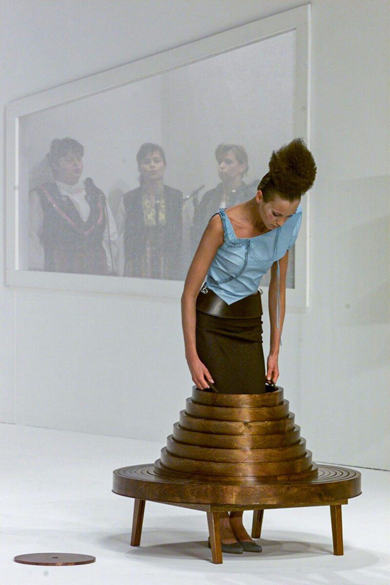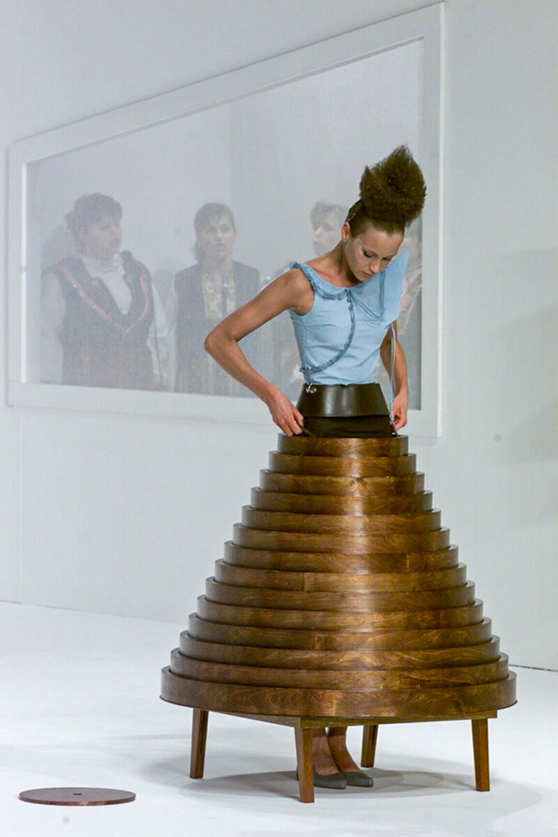 Не поленитесь потратить 10 минут, чтобы посмотреть этот показ-перформанс, который и сегодня, спустя почти 20 лет, актуален и смотрится довольно свежо. Полная трансформация интерьера в одежду — канонический пример смещения границ между модой и интерьерным дизайном.