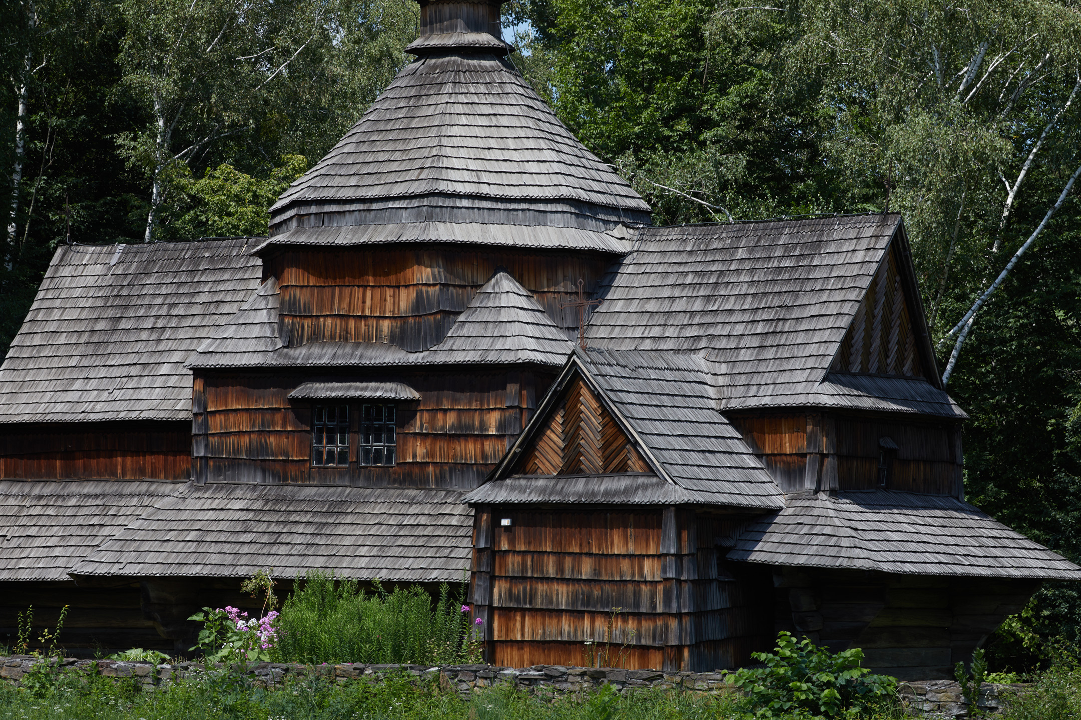 «Ви бачите церкву Святого Миколая 1817 року. Її дзвіниця побудована в 1930 і має кілька хрестів. Коли церковне подвір’я вирішили зменшити, виявилося, що межа пройде по могилах, тому могильні хрести було вирішено вмурувати прямо в огорожу. Що ж до будівлі, то це церква зрубної конструкції на кам’яній підвалині. Навколо церкви — спеціальна конструкція для захисту стін від опадів. Там також можна було посидіти й відпочити», — розповів експерт.