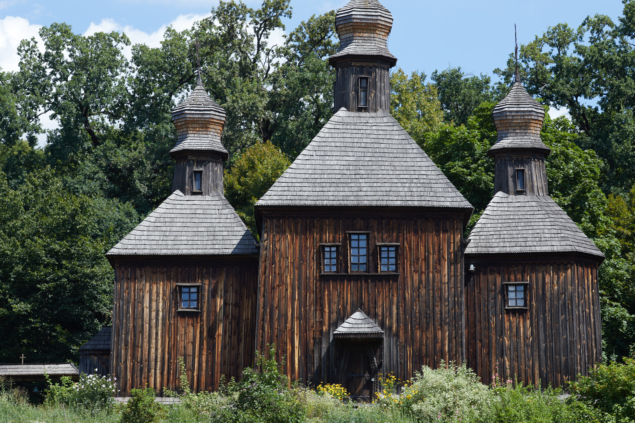 «У Музеї під відкритим небом також є церква ХVІІ століття. До речі, на зображеннях французького мандрівника та архітектора Гійома де Боплана є точно така ж споруда — ми припускаємо, що це та сама церква або інша, але дуже на неї схожа. Експонат має зрубну конструкцію — вона тризрубна і триверха, що звично для України. Цей тип церкви з’явився в часи Русі і проіснував до початку ХІХ століття, коли постановою російського церковного синоду цей стиль будівництва було заборонено. Тоді в Україні почали будувати церкви або однозрубні, або тризрубні, але одноверхі, з’єднані із дзвіницею. І хоч росіяни насаджували тут свої будівельні традиції, багато вчених, наприклад, Драган та Щербаківський, вважали, що українське церковне будівництво унікальне, і будівлі в такому стилі можна порівнювати тільки з японськими пагодами», — пояснив Руслан Дубина.