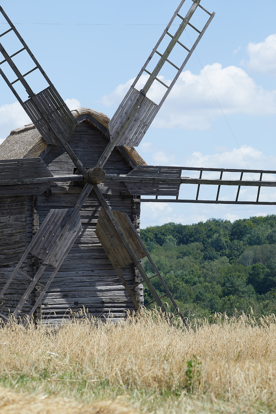 «Існували вітряки шатрового, стовпового й козлового типів. Наприклад, на Волині дуже високий рівень ґрунтових вод, тому тамтешні вітряки ставили на конструкцію, схожу на хрестовину для ялинки, а їхні крила закріплювали спеціальними розкосами — кізлами. Шатровий вітряк відрізнявся тим, що мав поворотний дах, що рухався разом із валом та всією внутрішньою конструкцією. В музеї ми також маємо унікальний вітряк, конструкція котрого проходить через усю споруду, — він не двоповерховий, а триповерховий: у підвалі споруди знаходяться колеса, які передають крутне зусилля на камінь жорен. Від самого верху вітряка, від валу, вниз іде торчовий вал десь 12 метрів завдовжки. Він має горизонтальну шестерню й обертає дві баклуші, закріплені у двох жорнах», — розповів науковець.