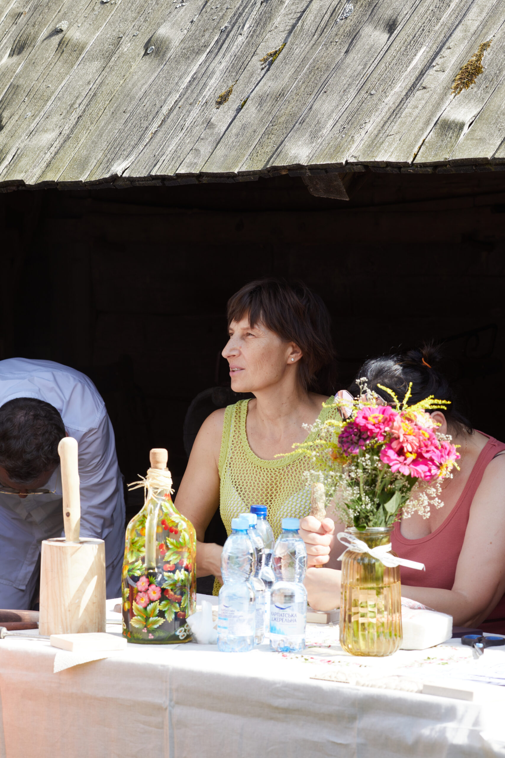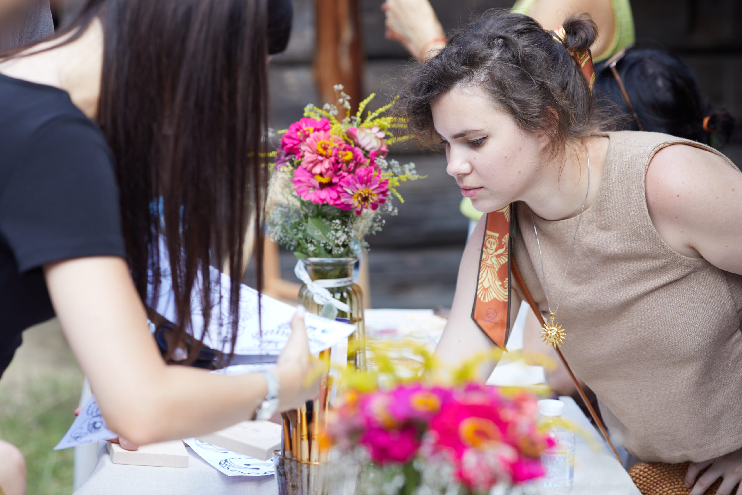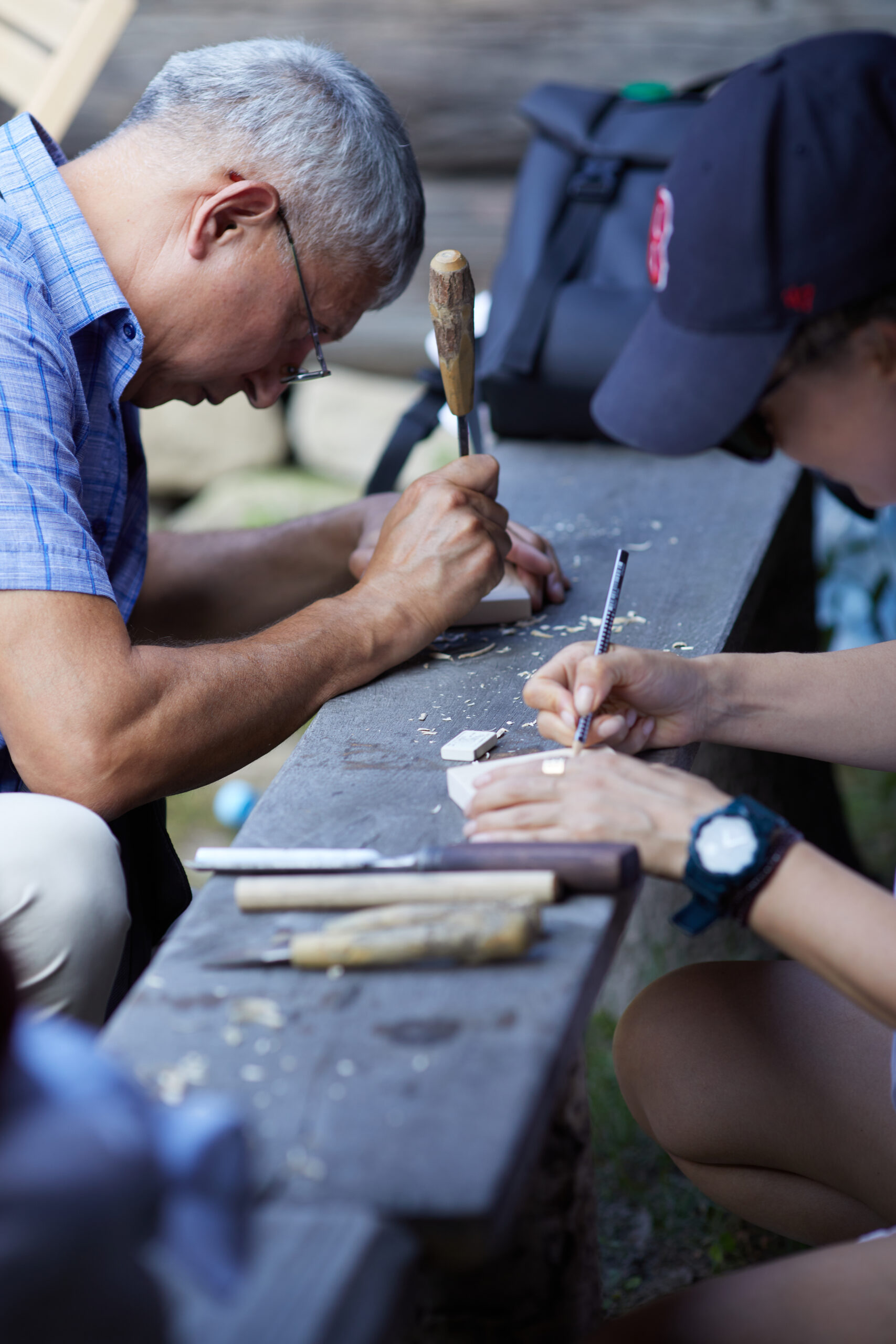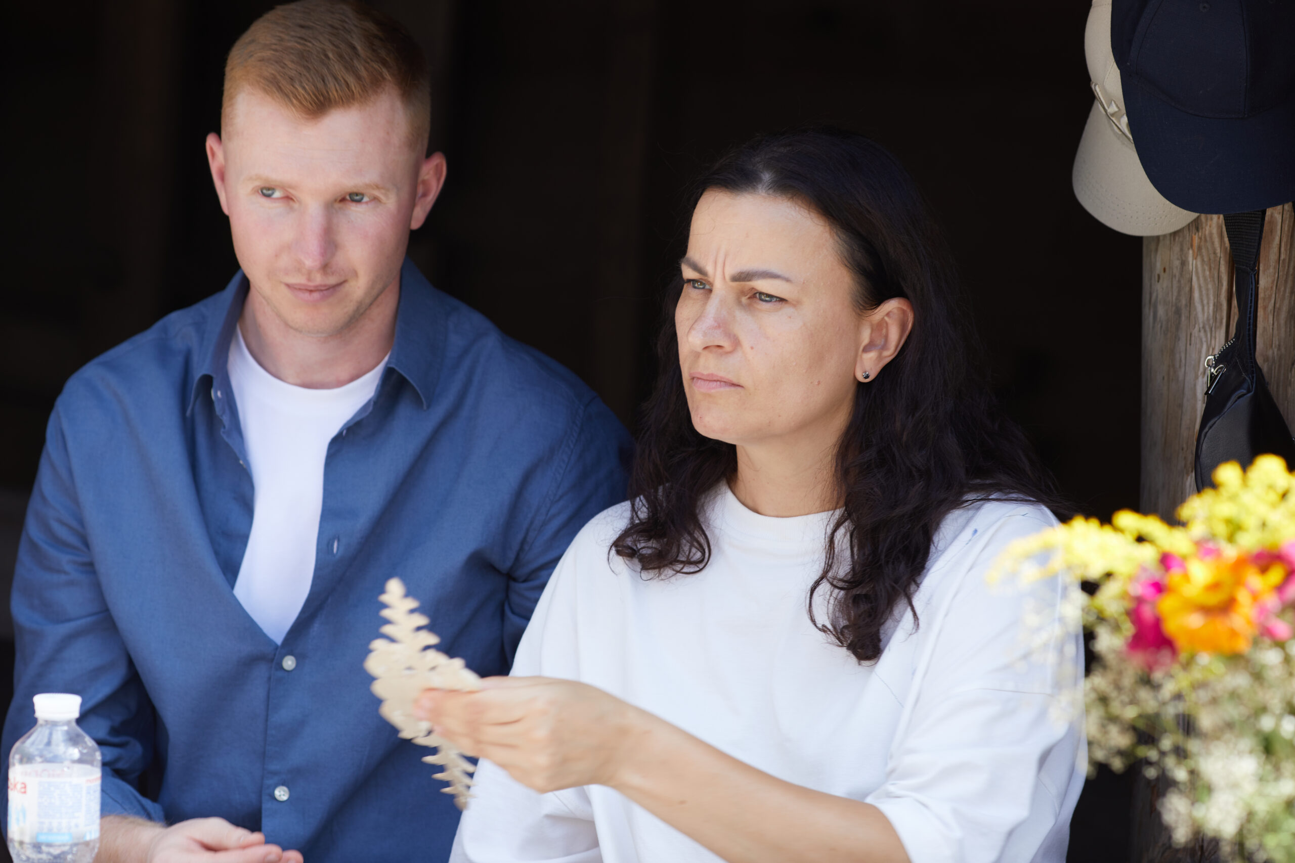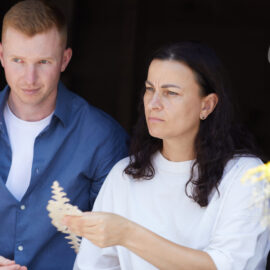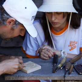 «У вас є шматочки дерева — на них ви можете малювати фарбами. На столі лежать українські польові квіти, і ви можете обрати найкращу квітку й намалювати її. Щодо різьби, то можете вирізати те, що хочете, чи візерунок по заготовці — на заготовках є замальовка олівцем. Якщо хочете попрацювати поталлю, то будь ласка: разом подивимося, як матеріал змінюється в процесі роботи».