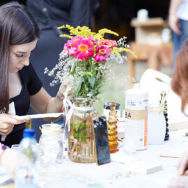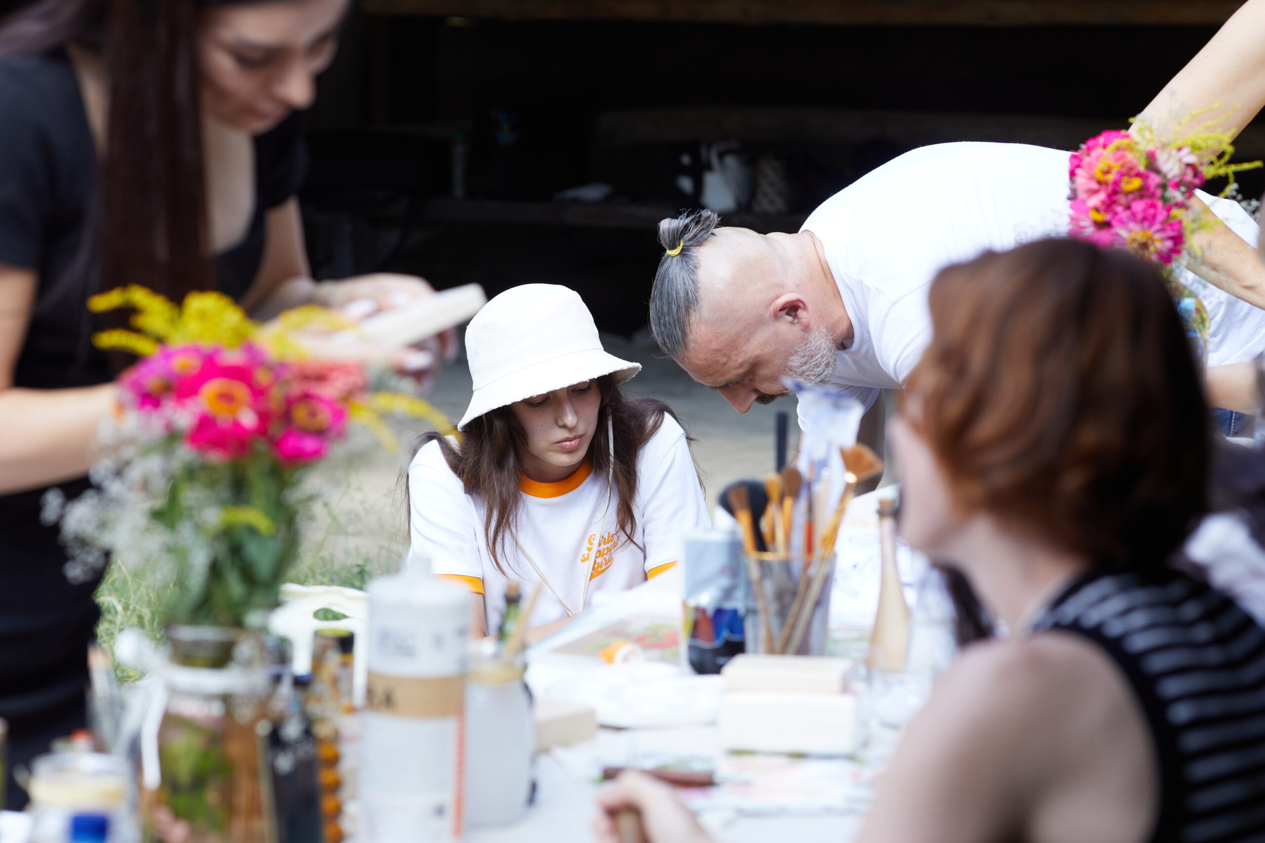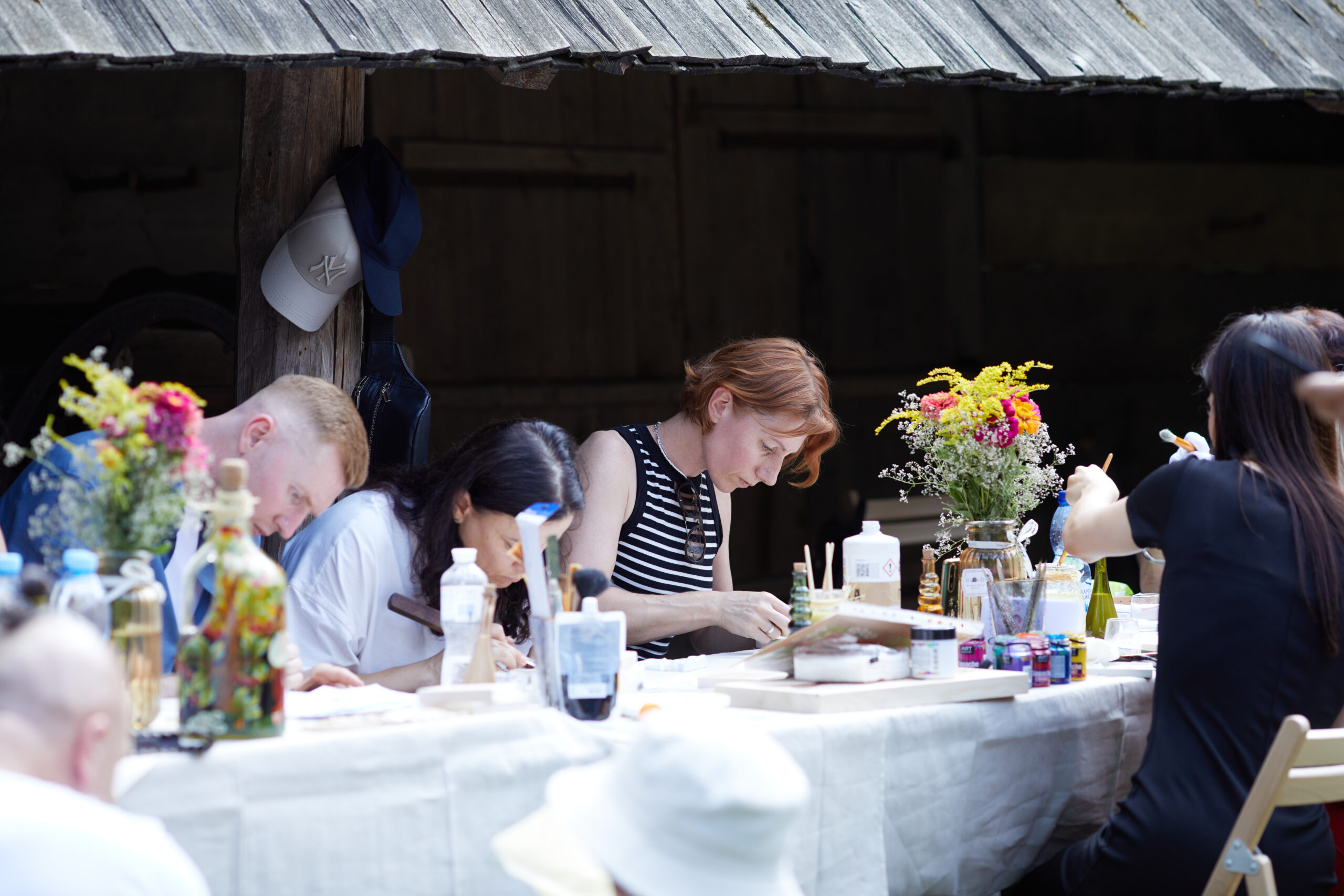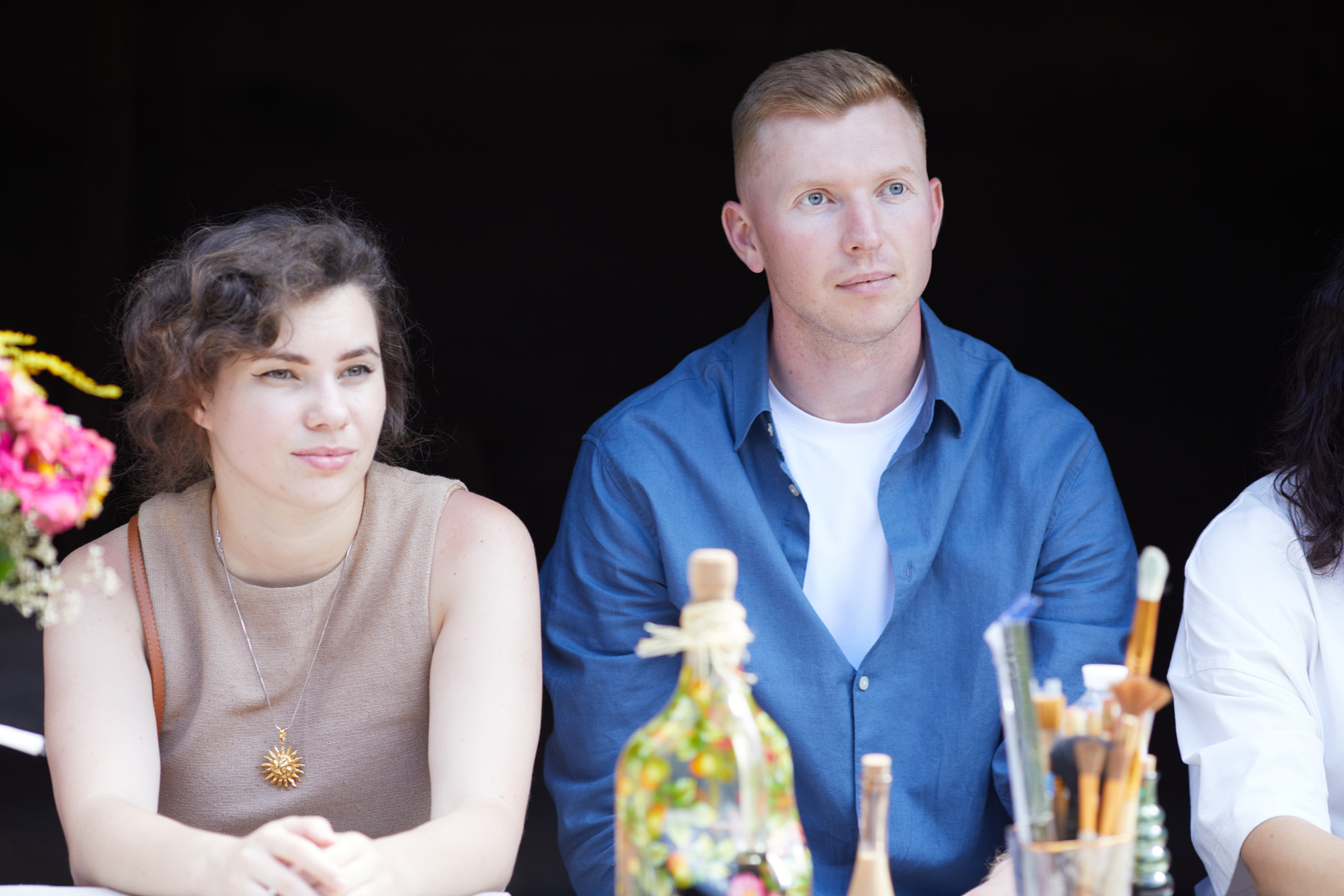 «У вас є шматочки дерева — на них ви можете малювати фарбами. На столі лежать українські польові квіти, і ви можете обрати найкращу квітку й намалювати її. Щодо різьби, то можете вирізати те, що хочете, чи візерунок по заготовці — на заготовках є замальовка олівцем. Якщо хочете попрацювати поталлю, то будь ласка: разом подивимося, як матеріал змінюється в процесі роботи».