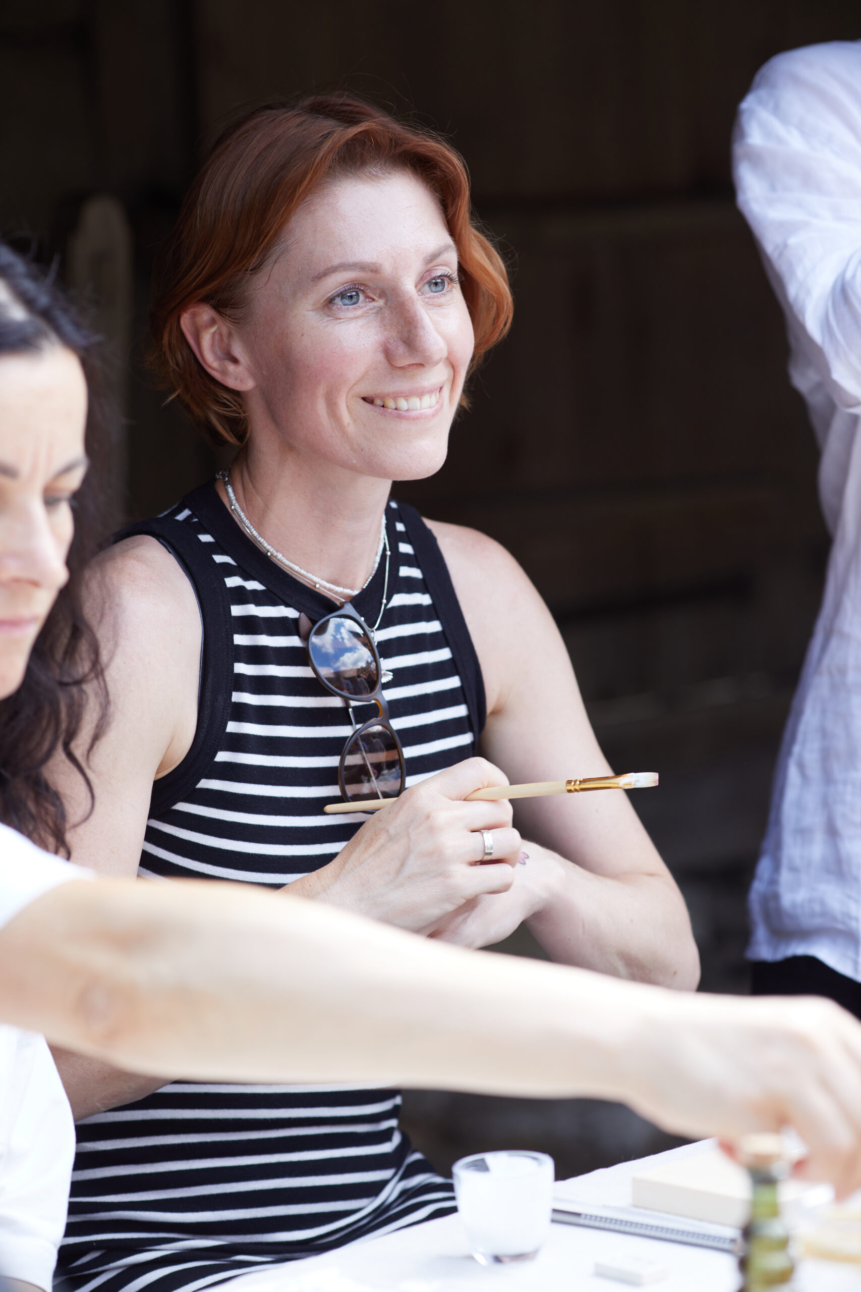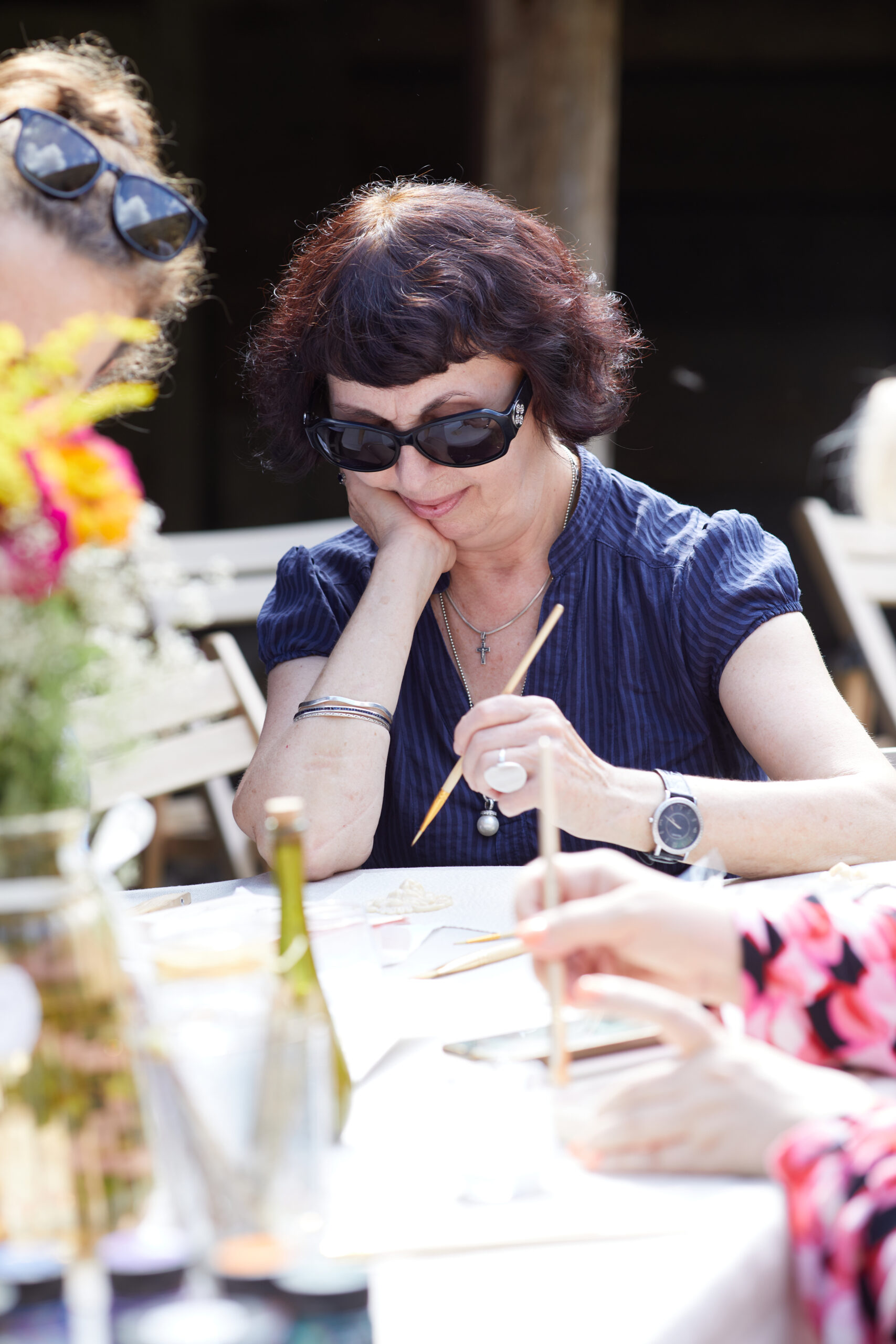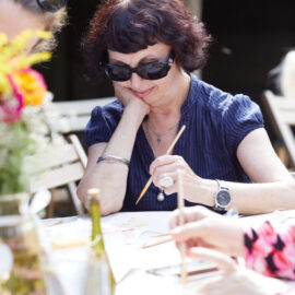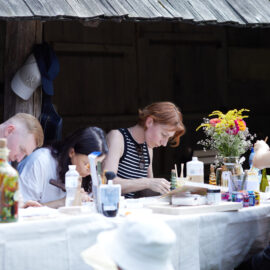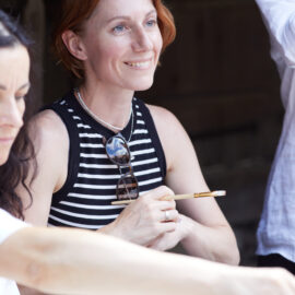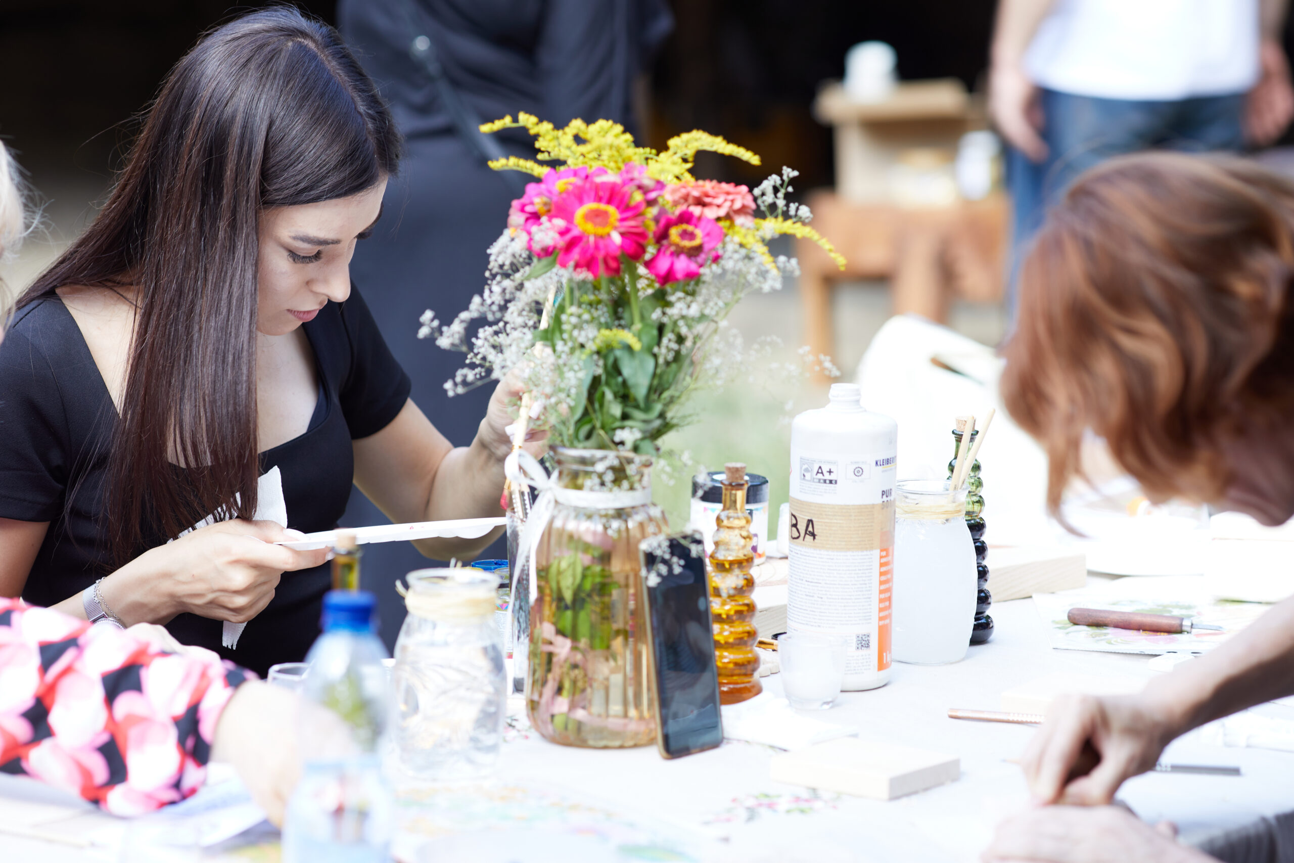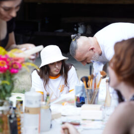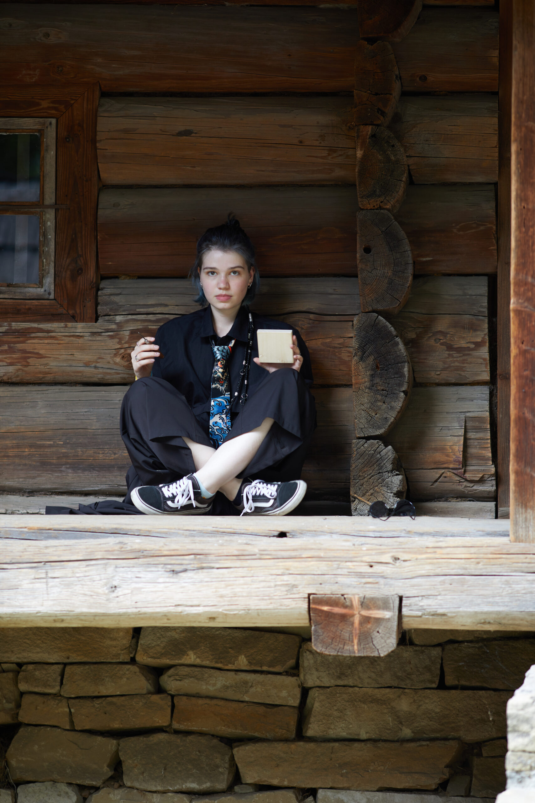 «У вас є шматочки дерева — на них ви можете малювати фарбами. На столі лежать українські польові квіти, і ви можете обрати найкращу квітку й намалювати її. Щодо різьби, то можете вирізати те, що хочете, чи візерунок по заготовці — на заготовках є замальовка олівцем. Якщо хочете попрацювати поталлю, то будь ласка: разом подивимося, як матеріал змінюється в процесі роботи».