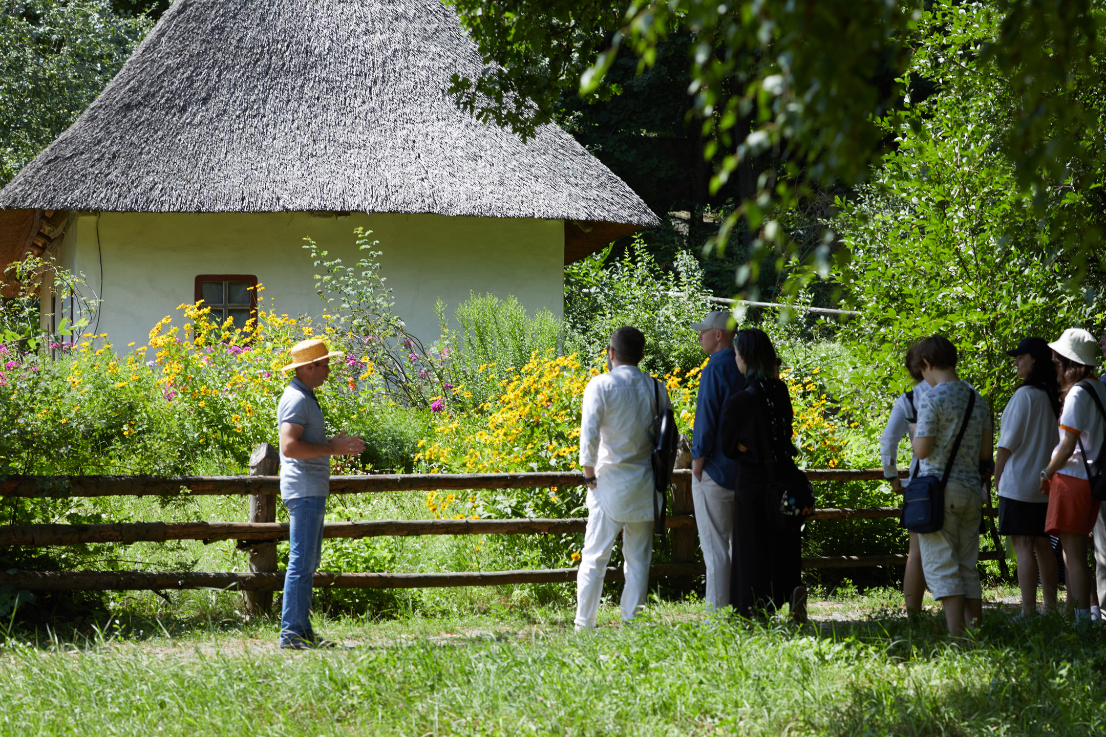 «Ви бачите хату зрубної конструкції зі стінами, що мали обплетення лозою у вертикальному вимірі. У 2018 році почалася реконструкція, і ми замінили їх на стіни з бруса, обмазаного глиною. Дах був солом’яний, викладений уступами. Такі дахи трималися довше й були міцнішими, але дозволити їх собі могли лише заможні селяни, бо на виготовлення одного покриття треба було заготувати від тисячі до тисячі п’ятисот снопів. Зверніть увагу: в одному місці здається, що через дах майже видно небо, але при цьому він не пропускає воду. Також важливий момент: у ХІХ столітті в хатах уже були вікна, що відчинялися. При цьому всі будівлі орієнтували на схід чи південь», — розповів екскурсовод.