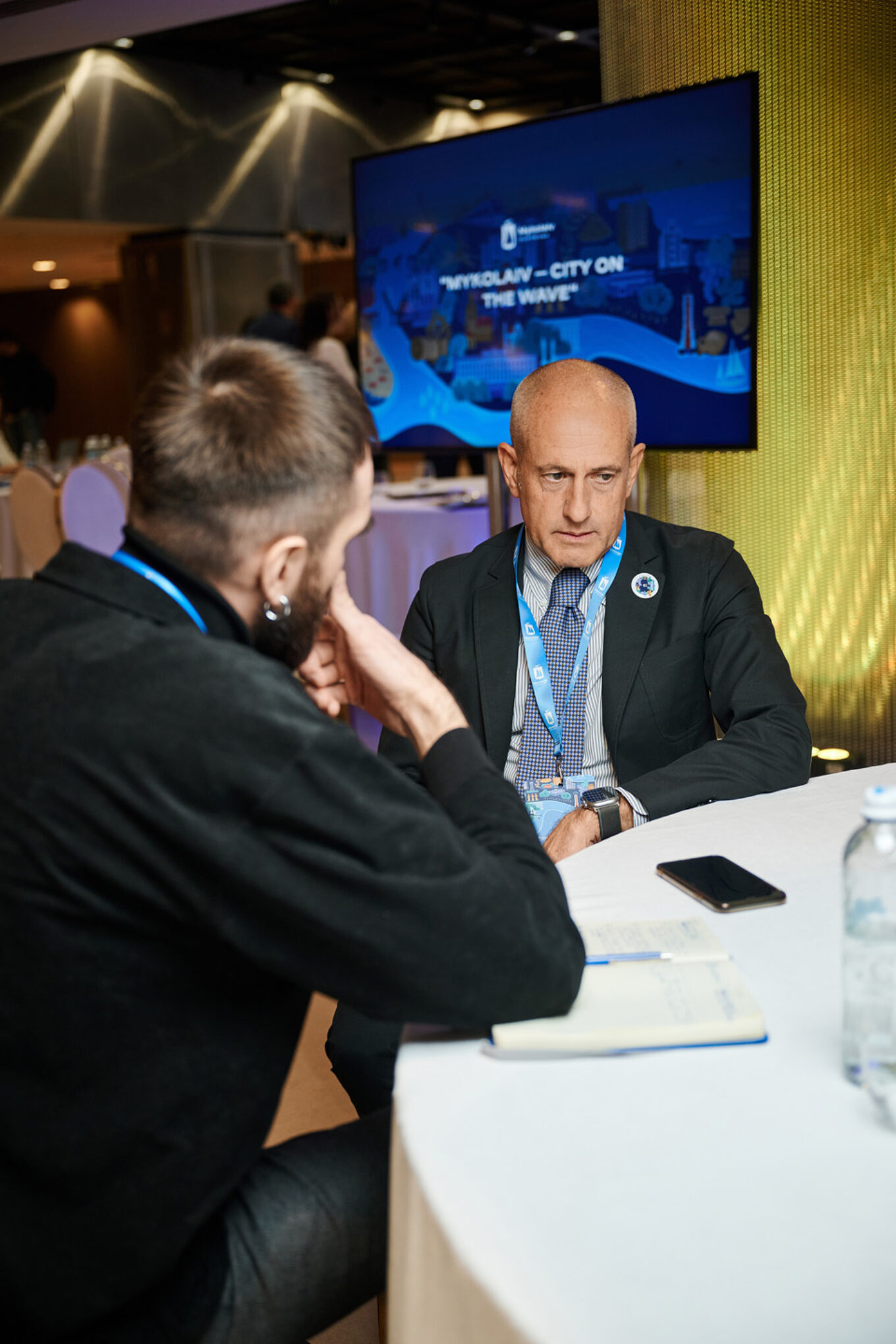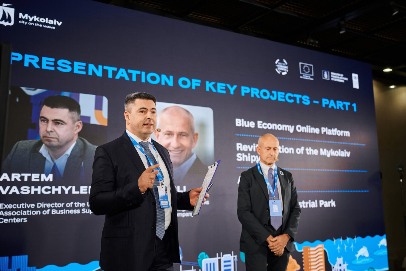 Директор Української асоціації центрів підтримки бізнесу Артем Ващиленко та керівний партнер компанії One Works Джуліо де Карлі під час конференції, присвяченої відбудові Миколаєва. Фото: Сергій Пірієв / ПРООН в Україні