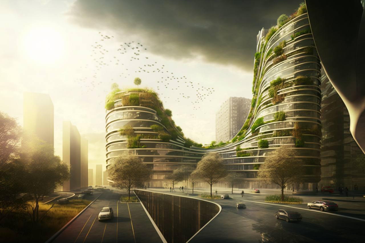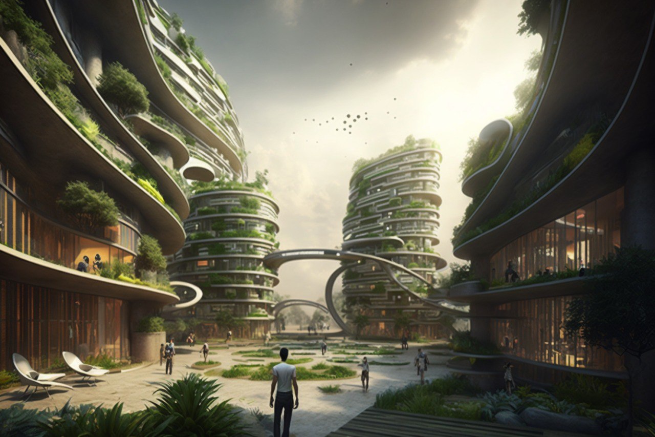 Ілюстрація, зроблена Миколою Морозовим за допомогою Midjourney, за запитом «житловий квартал майбутнього»