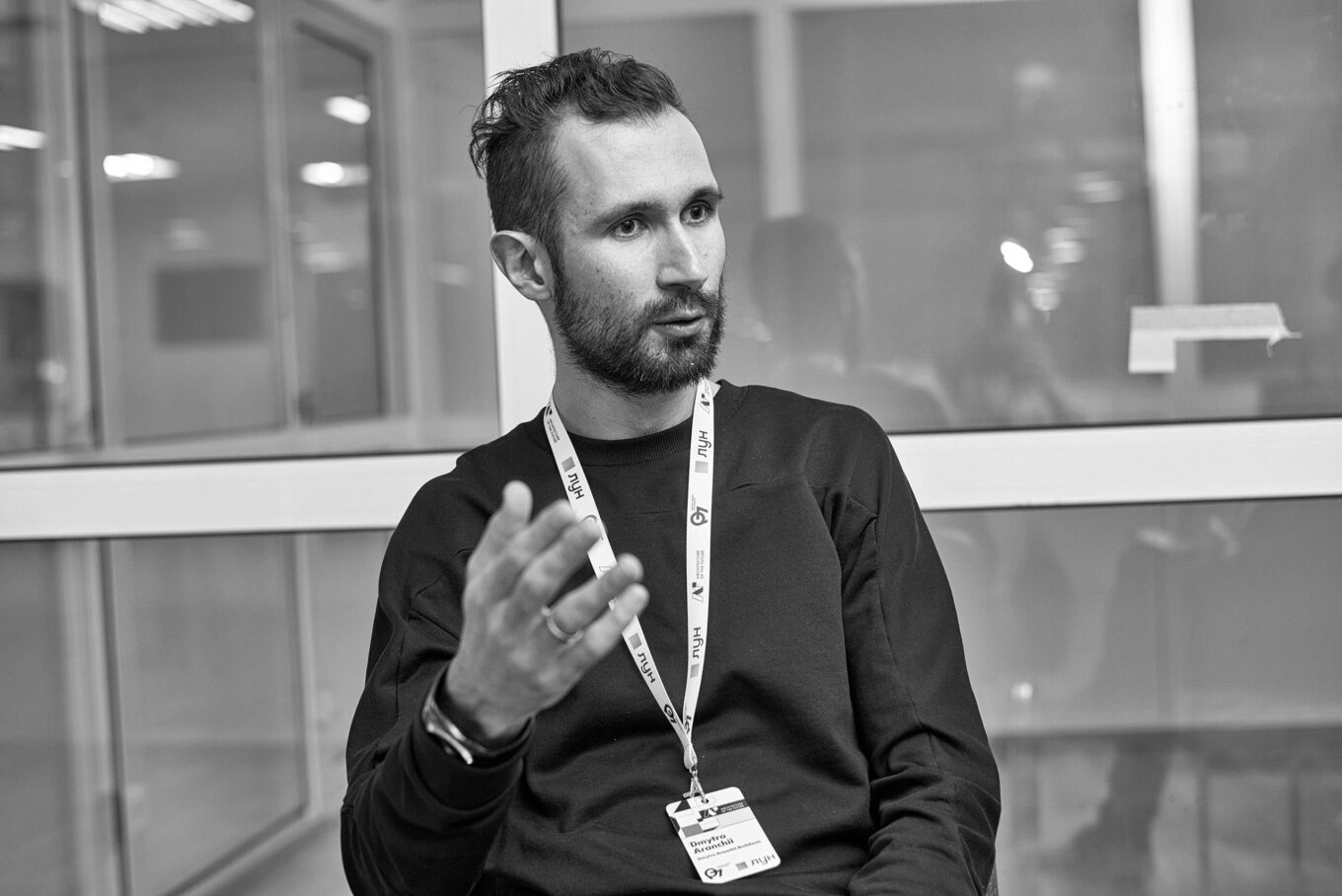 Дмитро Аранчій: Власне кажучи, параметрична інсталяція, точніше, інтерактивна, яку ми показували, починалась як задум для конкурсу. Тобто вона довго формувалась десь в голові. Потім ми її спроєктували для змагання. Нічого не виграли, але не полишили її. Я б не назвав місце, для якого ми створили цю інсталяцію, публічним простором. Скоріше, напівпублічним, бо це відкритий хол бізнес-центру. В принципі, туди може зайти будь-хто. Вона віддзеркалює людей, які ходять навколо неї та бачать своє відображення. Але в певний момент цей алгоритм зупиняється, зображення немов «відлипають» і починають взаємодіяти між собою за допомогою штучного інтелекту.