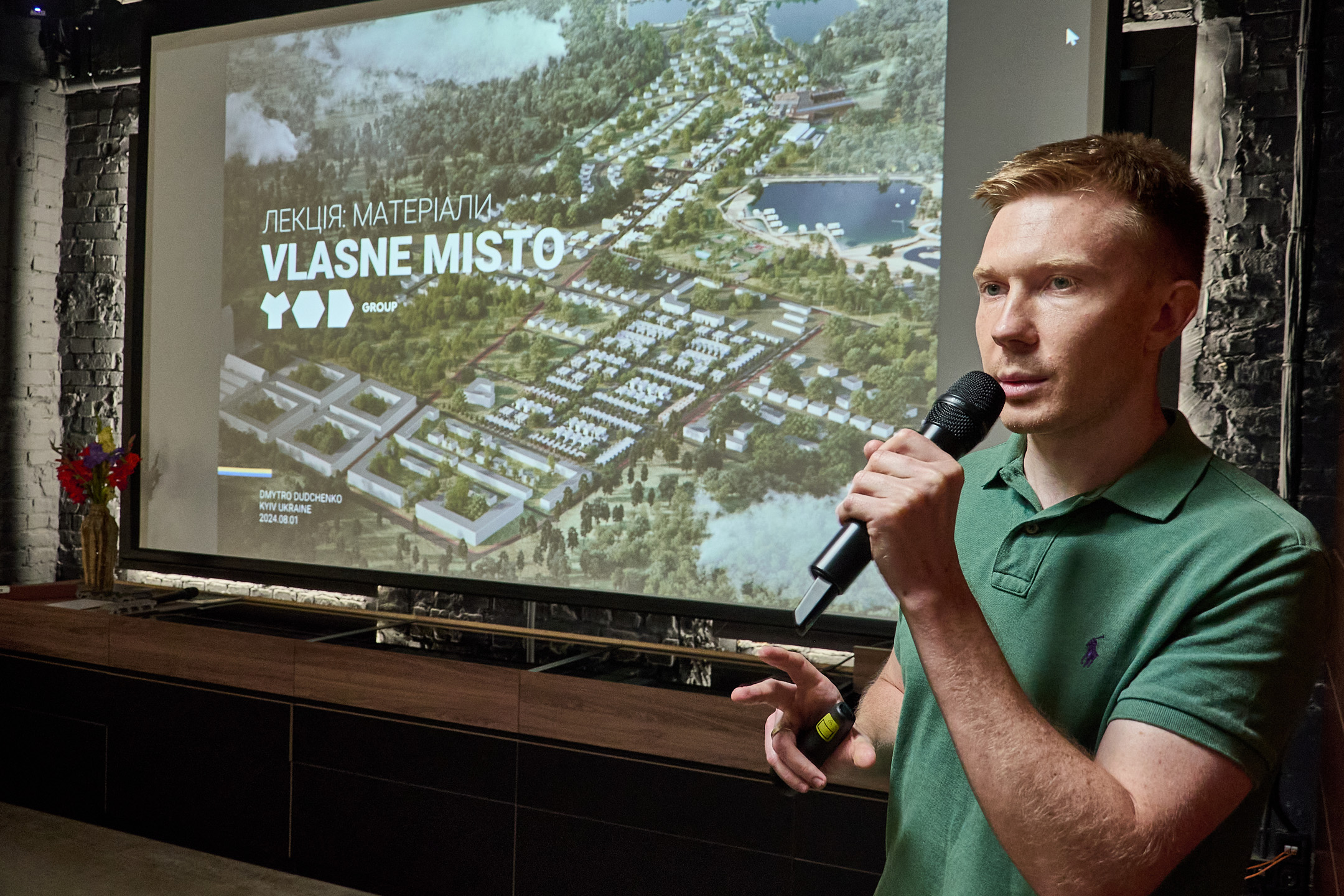 Продовжив тему використання матеріалів у проєкті Vlasne Misto Дмитро Дудченко — головний архітектор студії YOD Group, яка розробляла архітектурну концепцію кластерного міста. Дудченко зазначив, що у використанні матеріалів команда дизайнерів керується підходом швейцарського архітектора Петера Цумтора, який говорив: «Коли я починаю, моя перша ідея — це матеріал». У Vlasne Misto база матеріалів дуже велика, але загалом архітектурна концепція побудована на використанні трьох матеріалів: каменю, кераміки та дерева. Найважливішими критеріями, які допомагають обирати матеріали, є природність, локальність і довговічність.