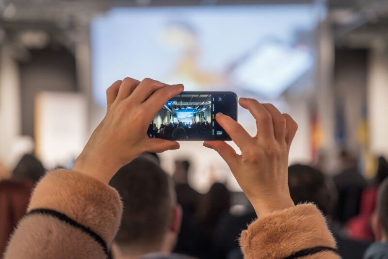 Виступ Олександри Азархіної в завершальній частині програми. На фоні можна побачити стенди, що репрезентують тези паралельних дискусій другого дня конференції