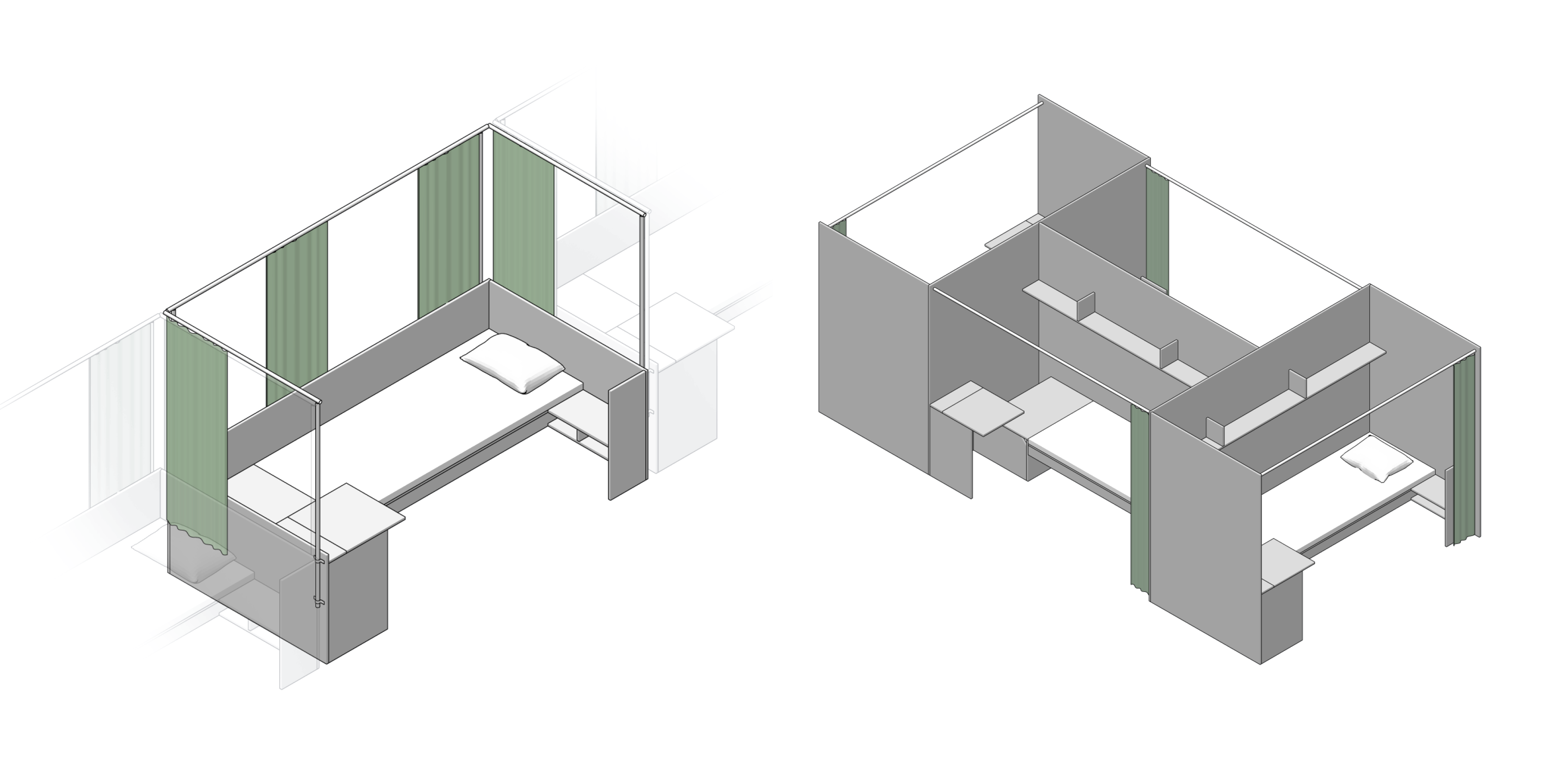 «Головною метою було зробити прості за формою меблі для щоденних потреб, — продовжує розповідь Андрій, — і виготовляти їх із доступних матеріалів, що забезпечило б швидке та недороге виробництво. Firanka ефективно розв’язує проблему оснащення великих просторів, де організовано розміщують ВПО, наприклад, тих же модульних містечок. До системи входять спальні модулі, по суті це окремі мінікімнати з ліжком, власними «стінами», полицями, вмонтованими приліжковими тумбами та ін. Також ми спроєктували секції роздягалень, загальну кухню, компактні меблі для зон відпочинку й дитячі меблі».