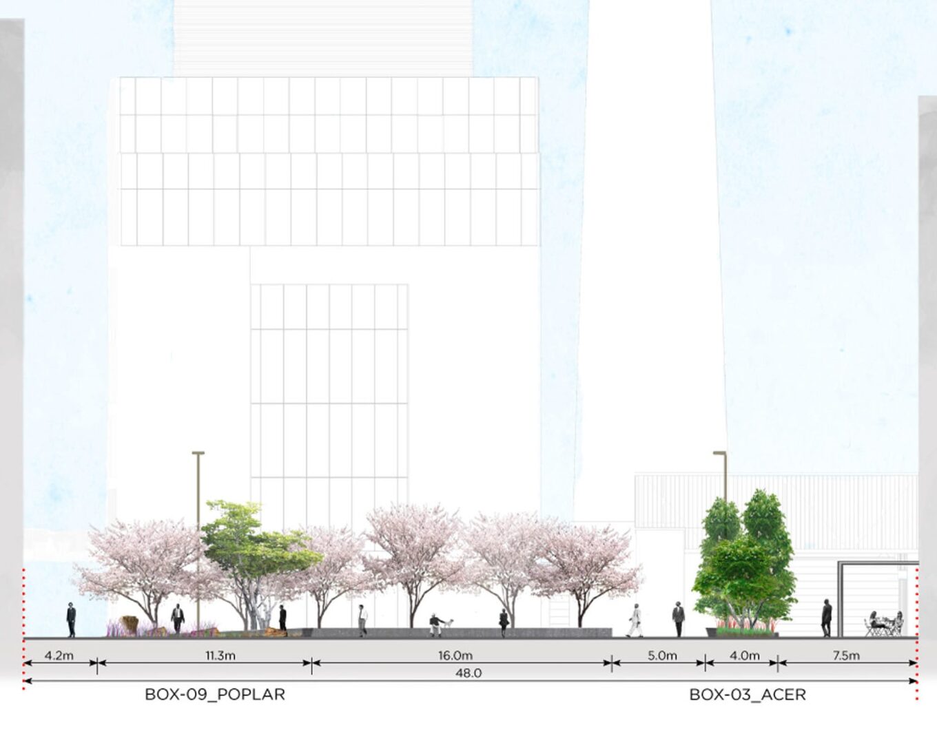 Л. Б.: Хироки ставил задачу: «Я хочу видеть то, что вызовет максимальные эмоции. Какие растения характерны для украинского Bento Box?» И мы начинали размышлять, как подобрать растения, которые безошибочно бы указали на украинскую идентичность. Предложили скомпоновать рябину, калину, мальвы. И еще — ягоды как напоминание о том, что изначально Bento Box — коробочка для ланча. Но в нашем случае это прежде всего шкатулка с впечатлениями. Поэтому наши Bento цветные. Есть, к примеру, салатовый, с овощными культурами. Есть юнит с сакурами как отсылка к традиционному вишневому японскому саду — и весной это будет впечатляющая феерия цветения. Есть Bento Box в бронзово-багровой гамме, с колоновидными буками, которые символизируют прочность, устойчивость, достоинство. Мы будем высаживать клены — полевой и серый, которые красивы в любой сезон, но осенью благодаря яркой листве становятся центром общей композиции. Они будут перекликаться с гинкго, листва которых с наступлением прохлады становится золотой. Так что в UNIT.City можно будет приходить на хана-гари и момидзи-гари (японские традиции любования весенним цветением и осенним убранством кленов. — Прим. ред). И еще у нас будет монохромный бокс, по сути белый, для которого подобраны растения с очень светлой листвой. Там будет солировать груша иволистная с бело-серой кроной, которая весной покрывается массой белоснежных цветов.